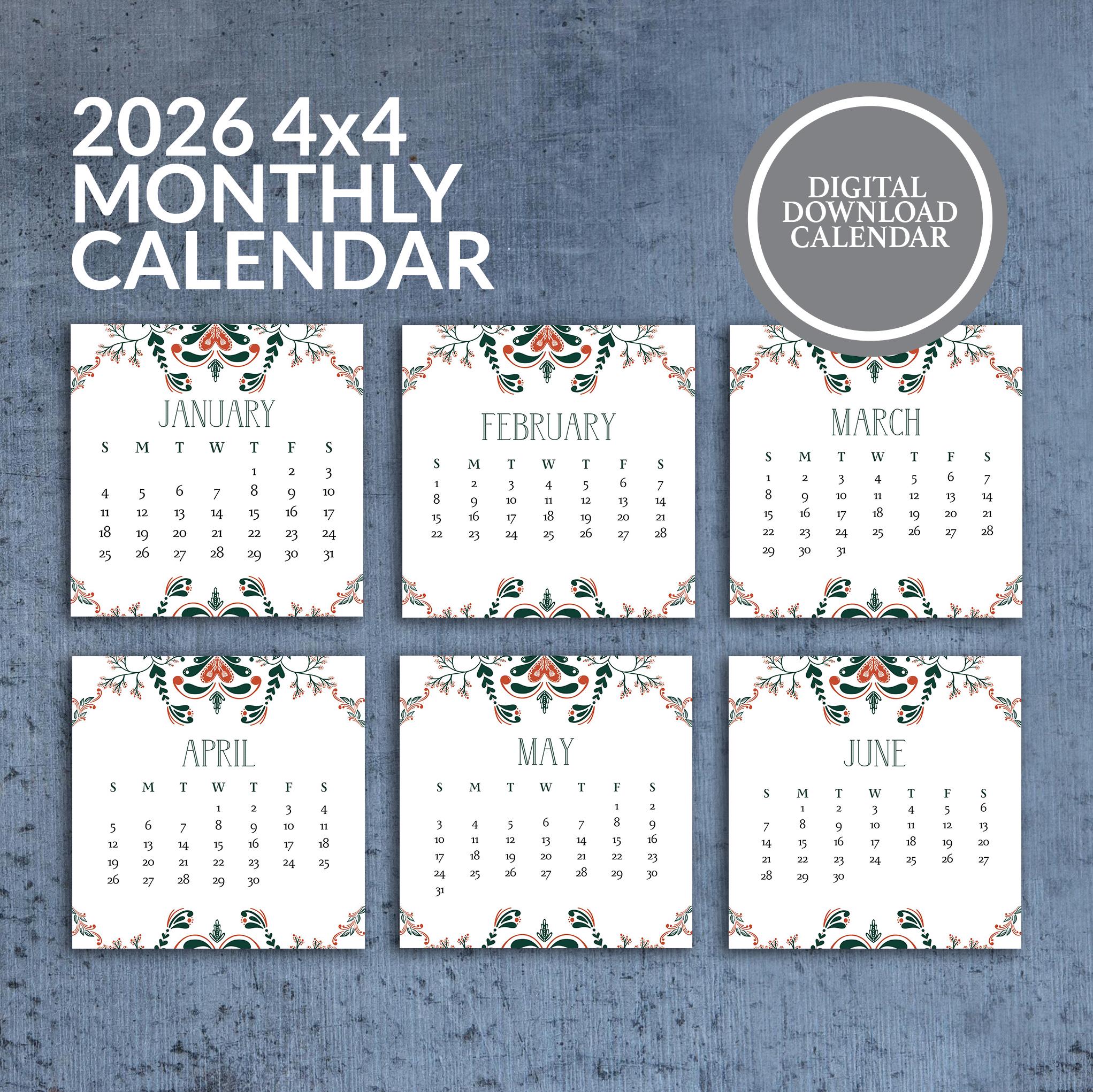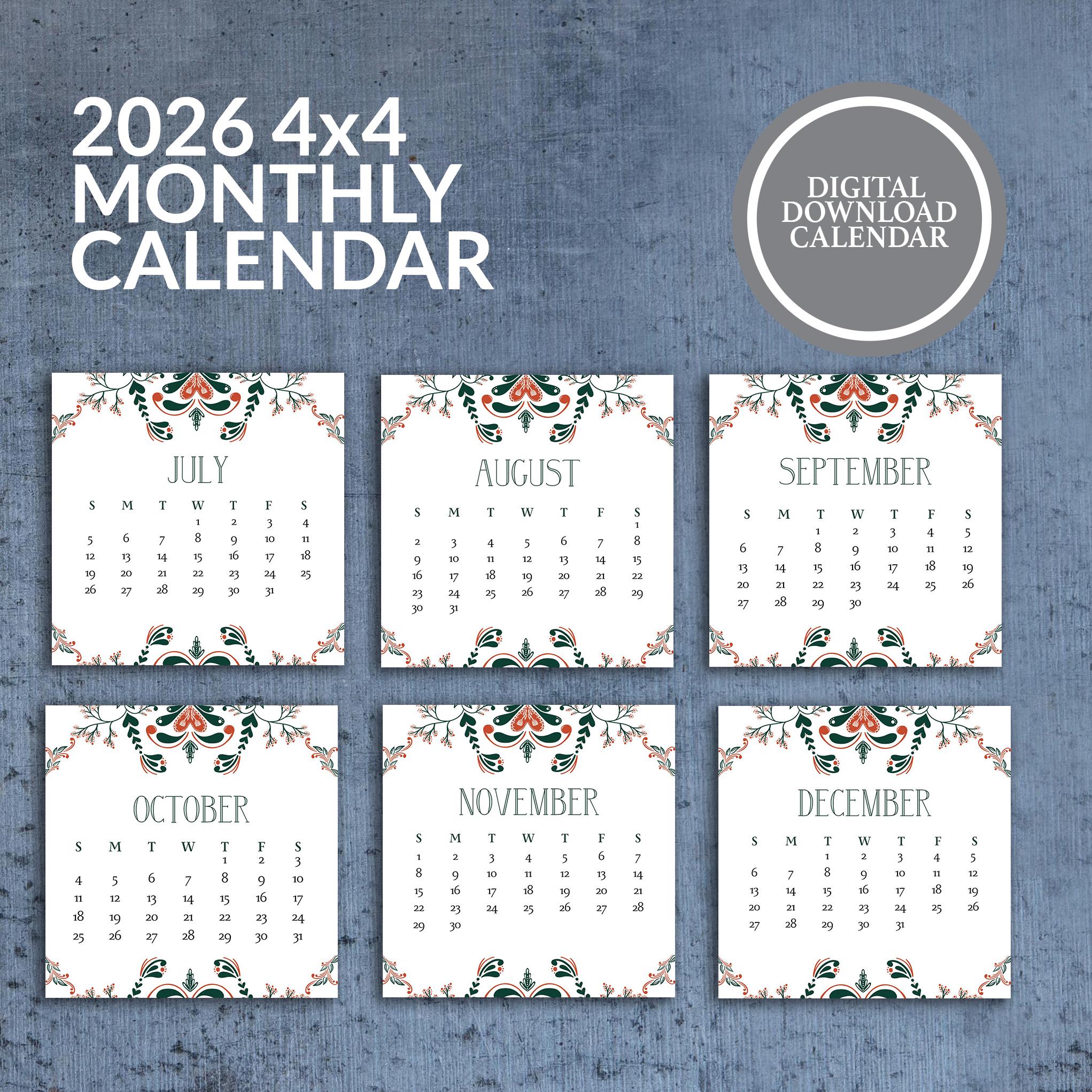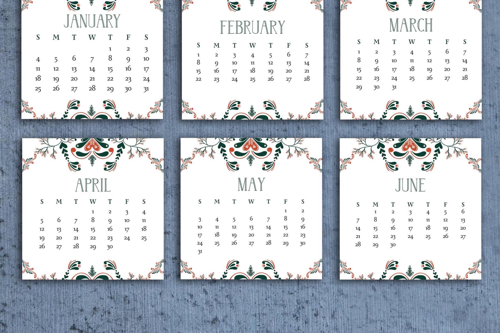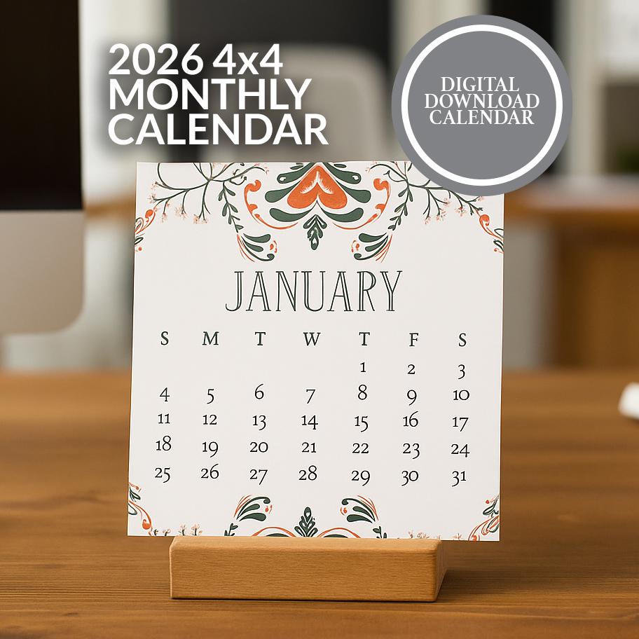 This 12-month calendar features 4×4 inch monthly cards, making it a compact yet decorative addition to your desk, shelf, or workspace. Each month showcases a different Scandinavian-inspired design, offering subtle variety while maintaining a cohesive look throughout the year. The pages are formatted on standard letter-size paper with trim lines, making it easy to print at home or through your favorite print shop.
