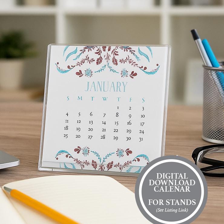 This 12-month calendar is sized at 4×4 inches, making it a compact yet eye-catching addition to your desk, shelf, or workspace. Each month features a different Scandinavian-inspired design, offering subtle variety while maintaining a cohesive look throughout the year. Simply print at home or at your favorite print shop, trim along the provided guidelines, and display in a desk stand or small frame.