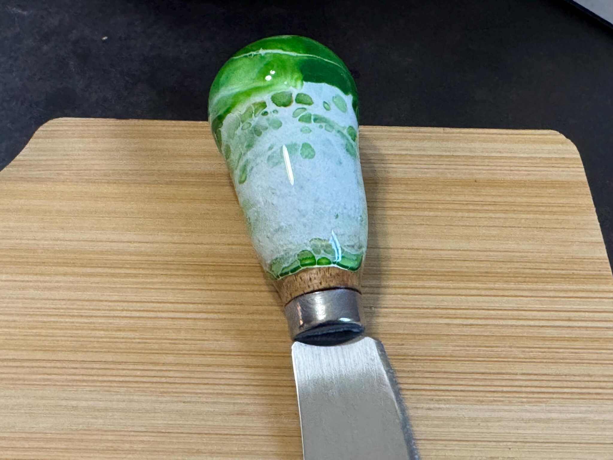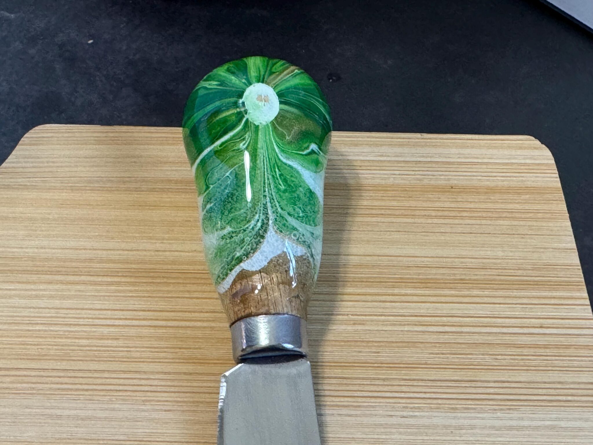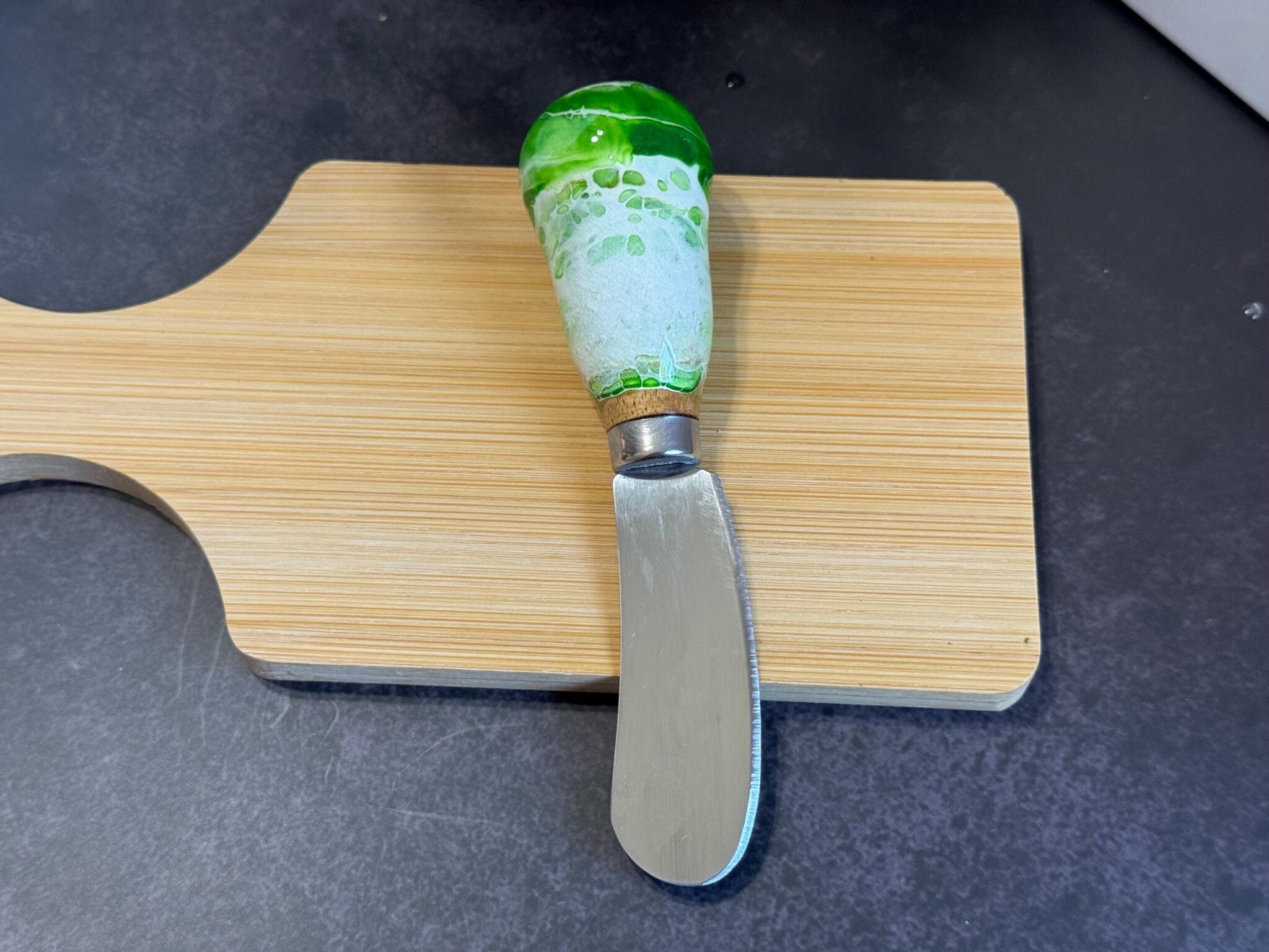 Welcome to BE Designs, where art meets functionality with our cheese knives, butter spreader or cheese slicer! Elevate your kitchen with our exquisite wood-handled cheese knife, lovingly hand-painted using the mesmerizing acrylic pouring technique and sealed with a protective resin coating.