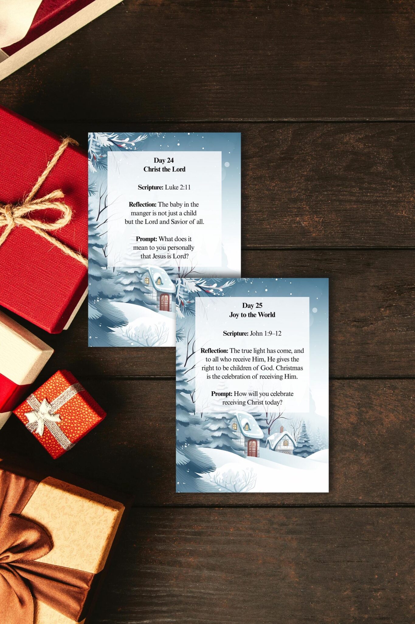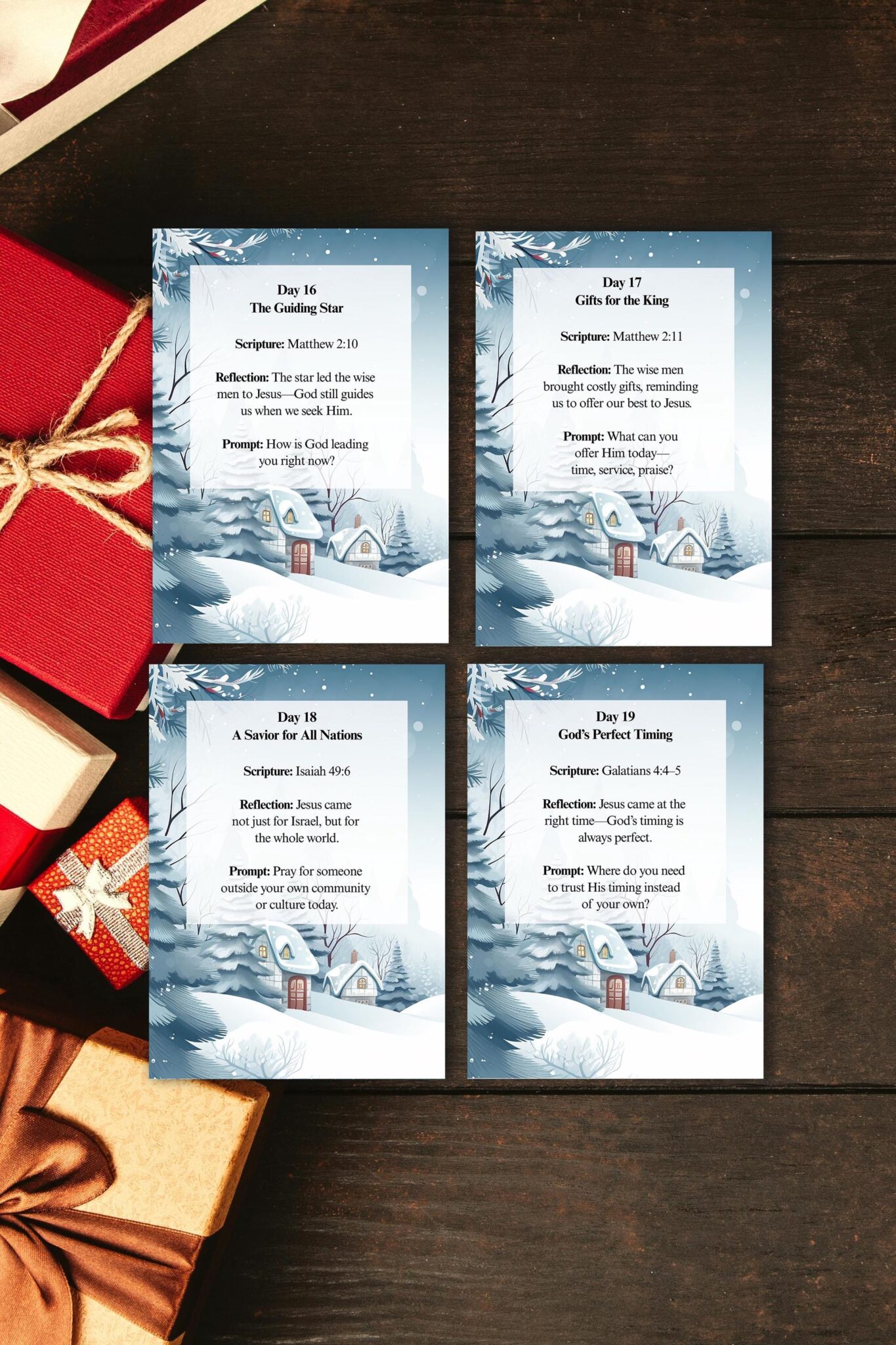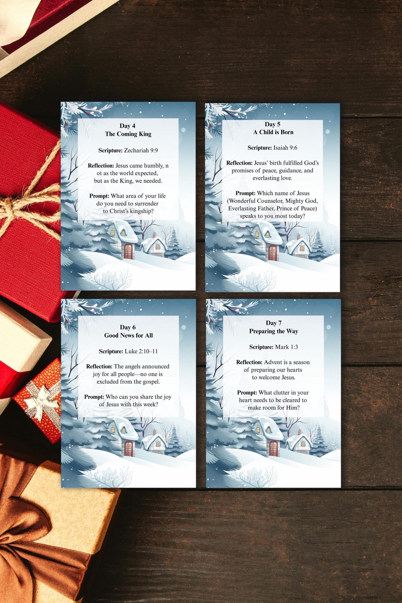 Each card includes a carefully chosen Scripture passage, a hope-filled devotional thought, and a simple prompt for journaling, prayer, or family conversation. Use them for personal quiet time, family devotions, or as part of your daily Advent rhythm.