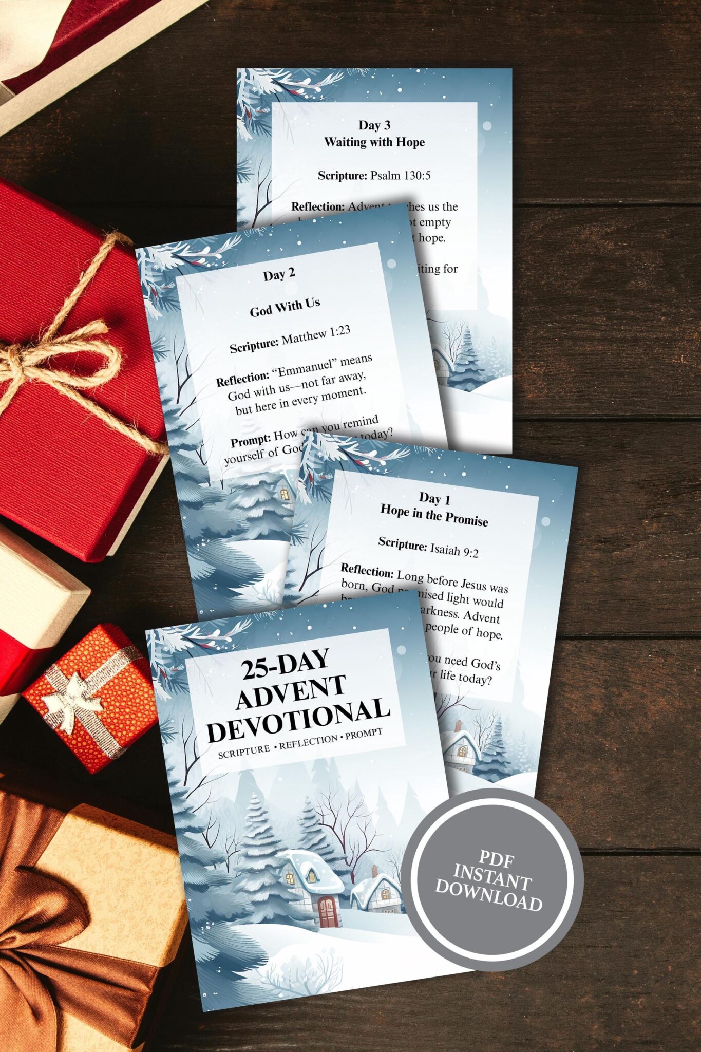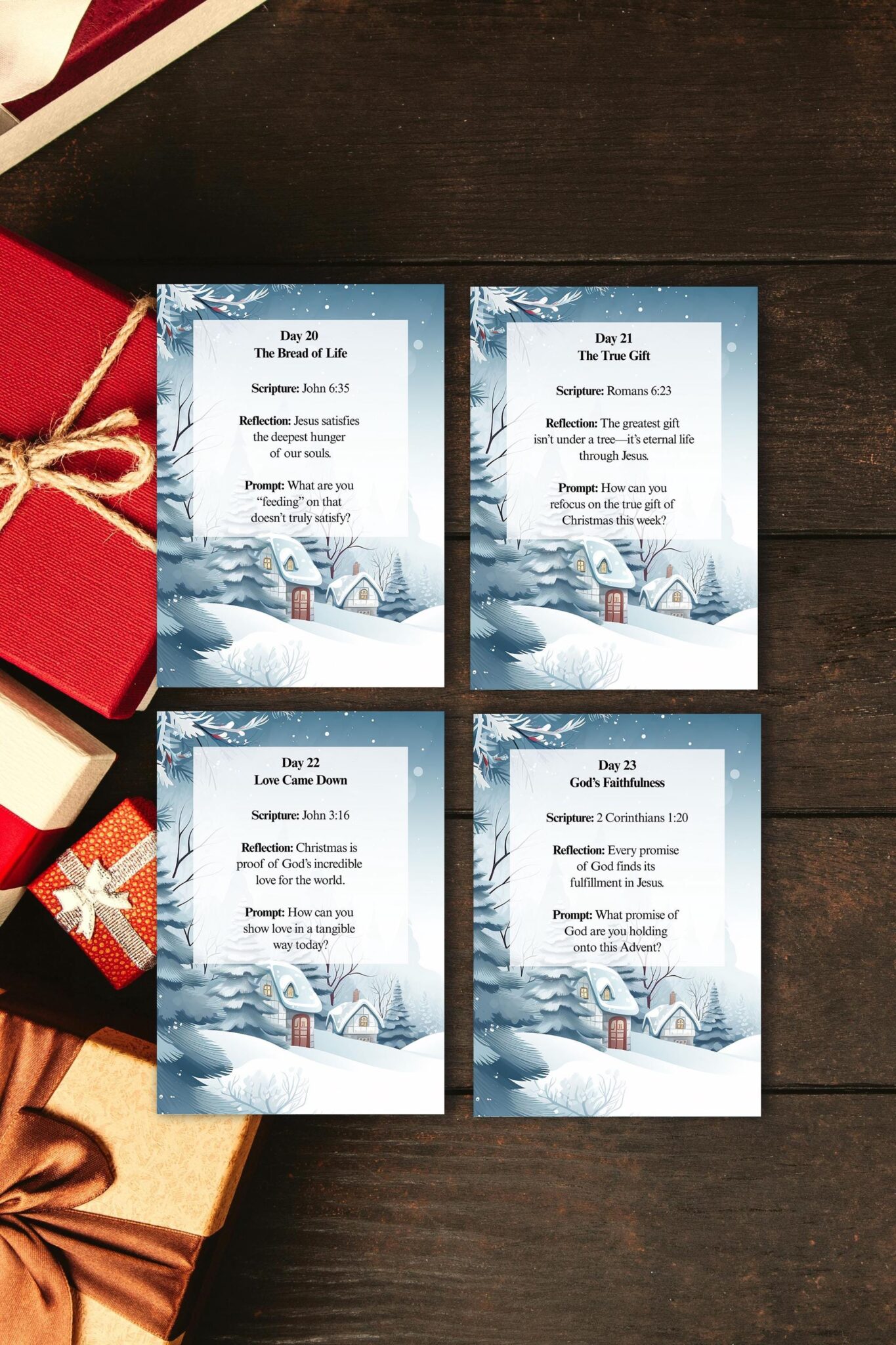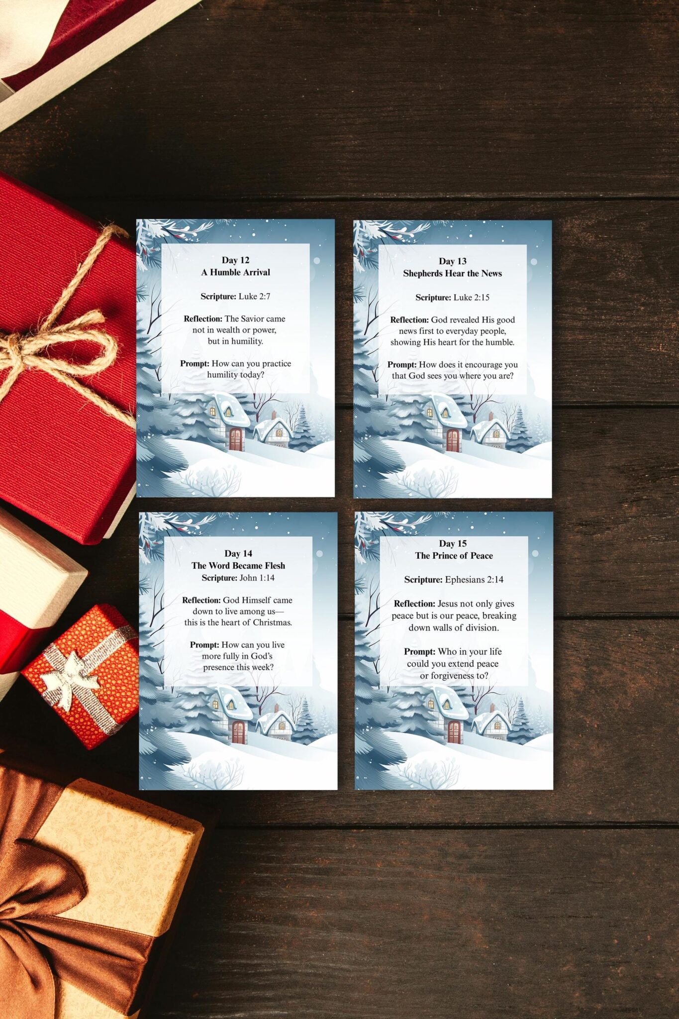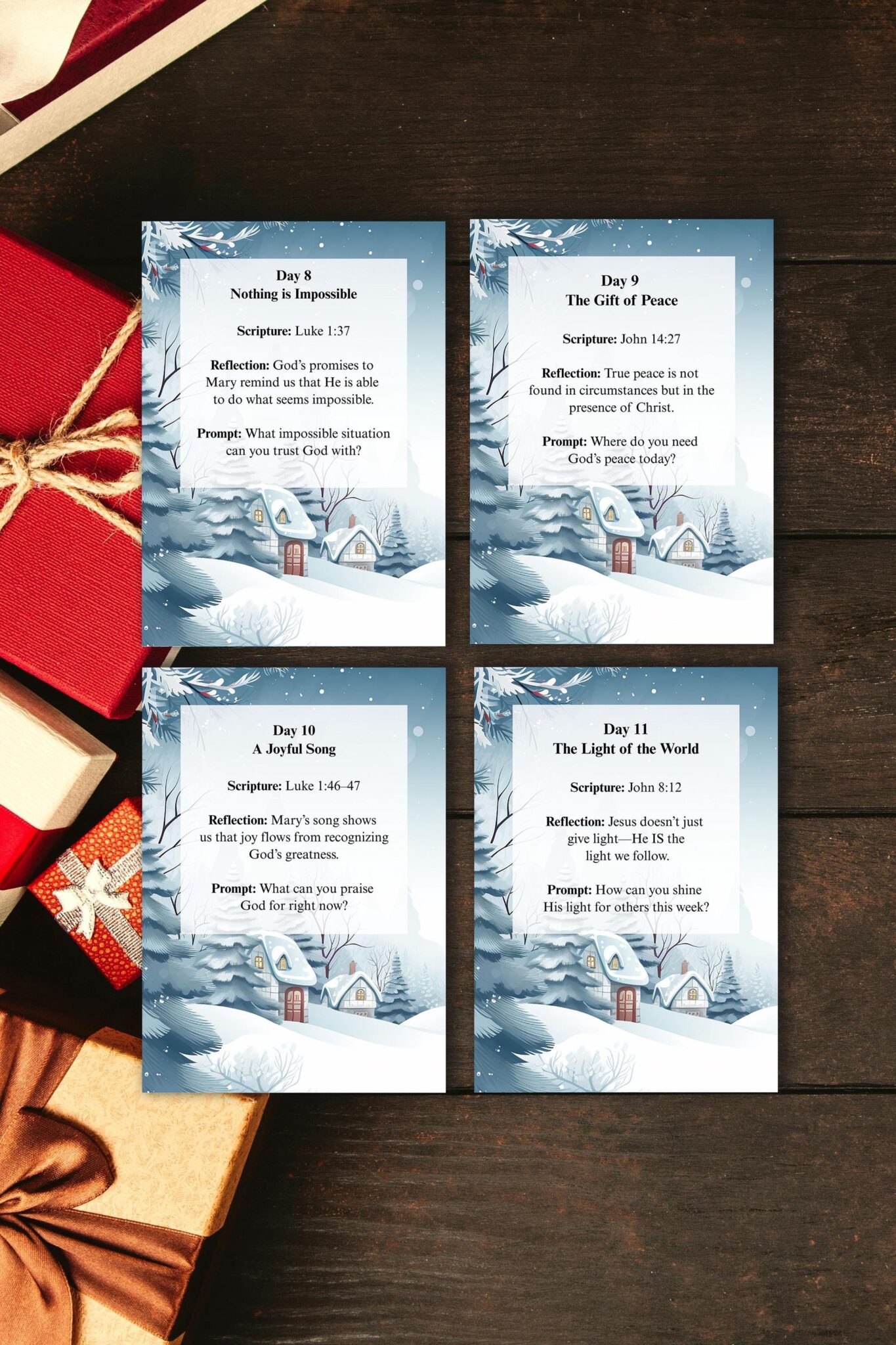 Each card includes a carefully chosen Scripture passage, a hope-filled devotional thought, and a simple prompt for journaling, prayer, or family conversation. Use them for personal quiet time, family devotions, or as part of your daily Advent rhythm.