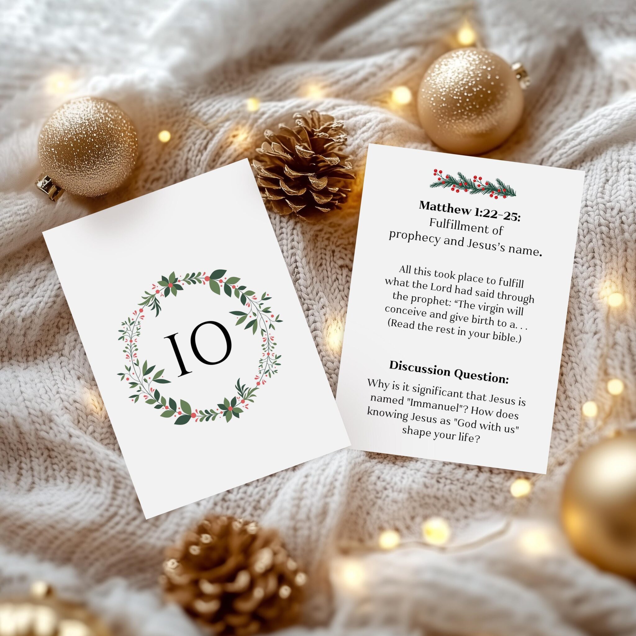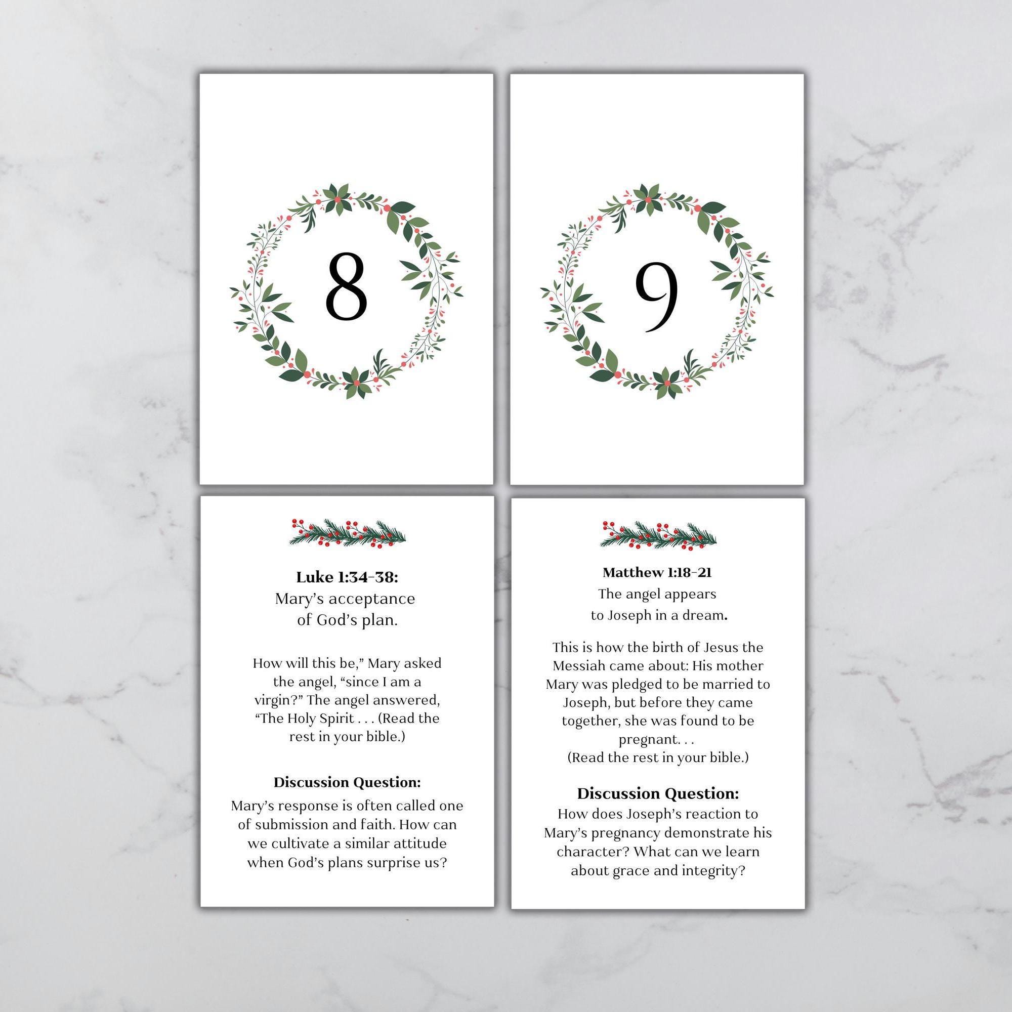 Make this Advent season extra special with our 24 Printable Advent Devotional Cards. Each 5x7-inch card is numbered on the front and features a scripture reference, title, verse excerpt, and a meaningful discussion question on the back. These cards are designed to spark thoughtful conversations and help your family focus on the story of Jesus throughout the Christmas season.