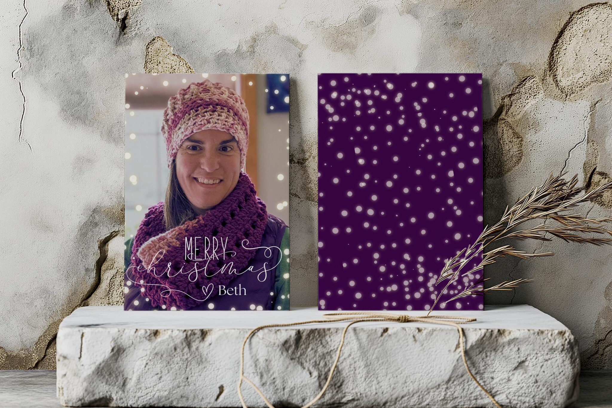 Share your holiday joy with this Merry Christmas Twinkle Lights photo card template! This editable digital design features space for one main photo on the front and four highlight photos on the back—with optional captions to personalize your message. You can also choose a solid or blank back for a simple look.