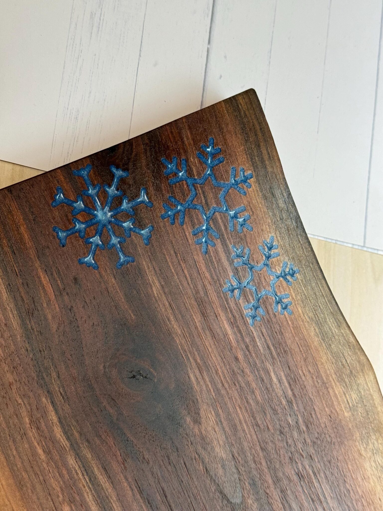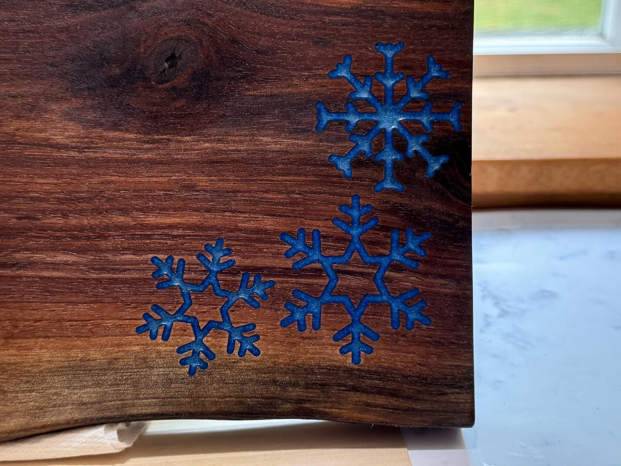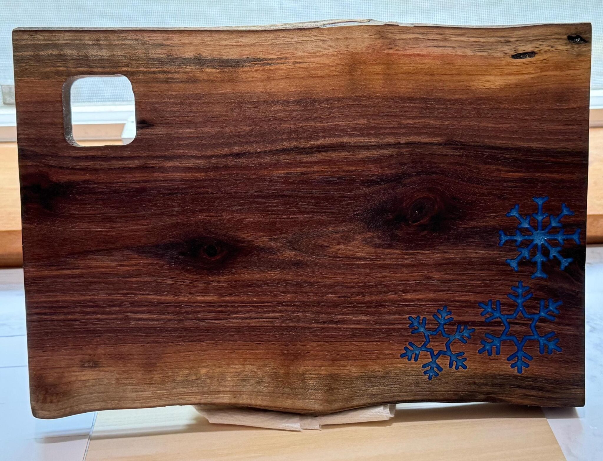 Introducing our exquisite Live Edge, Solid Wood Black Walnut Charcuterie Boards, Cheese Boards, or bread boards that were meticulously crafted to elevate your culinary presentation. This cutting board is perfect for holiday decor in any home. It is enhanced with a blue snowflakes that are inlaid into the board. The boards measure 12 inches x 8 inches approximately, this functional piece of art is perfect for any beach home or sailing aficionado. Ideal for serving fresh oven-baked bread, cheese, crackers, and a variety of appetizers, this resin cutting board masterpiece is visually stunning and practical. The fluid art design seamlessly wraps around the edges and is coated with resin, ensuring the durability and protection of the intricate paintwork.To enhance the natural grain of the wood, the entire board is coated in Walrus oil. Ideal for serving fresh oven-baked bread, cheese, crackers, and a variety of appetizers, this live edge cutting board masterpiece is visually stunning and practical. To enhance the natural grain of the wood, the entire board is coated in Walrus oil.