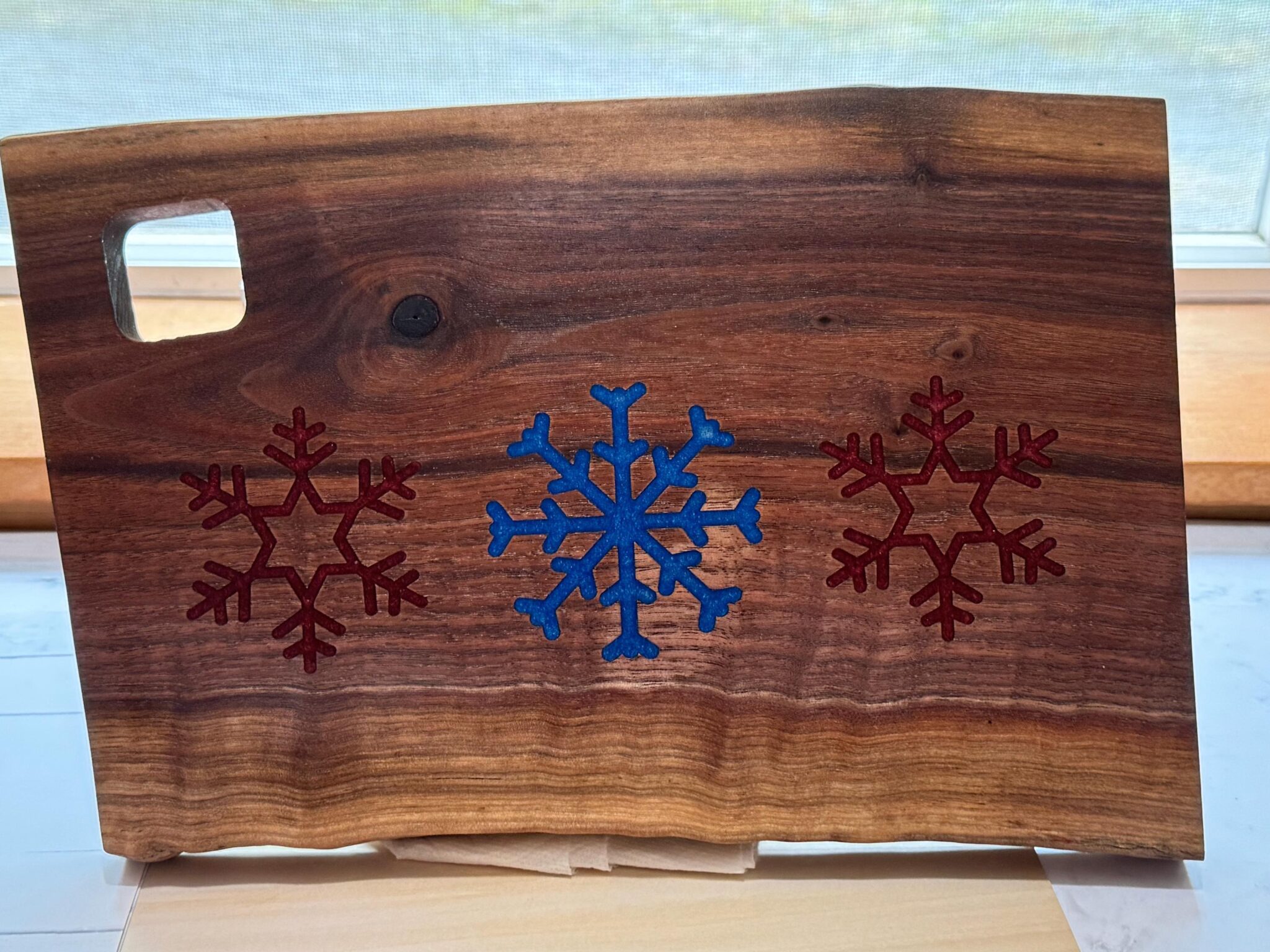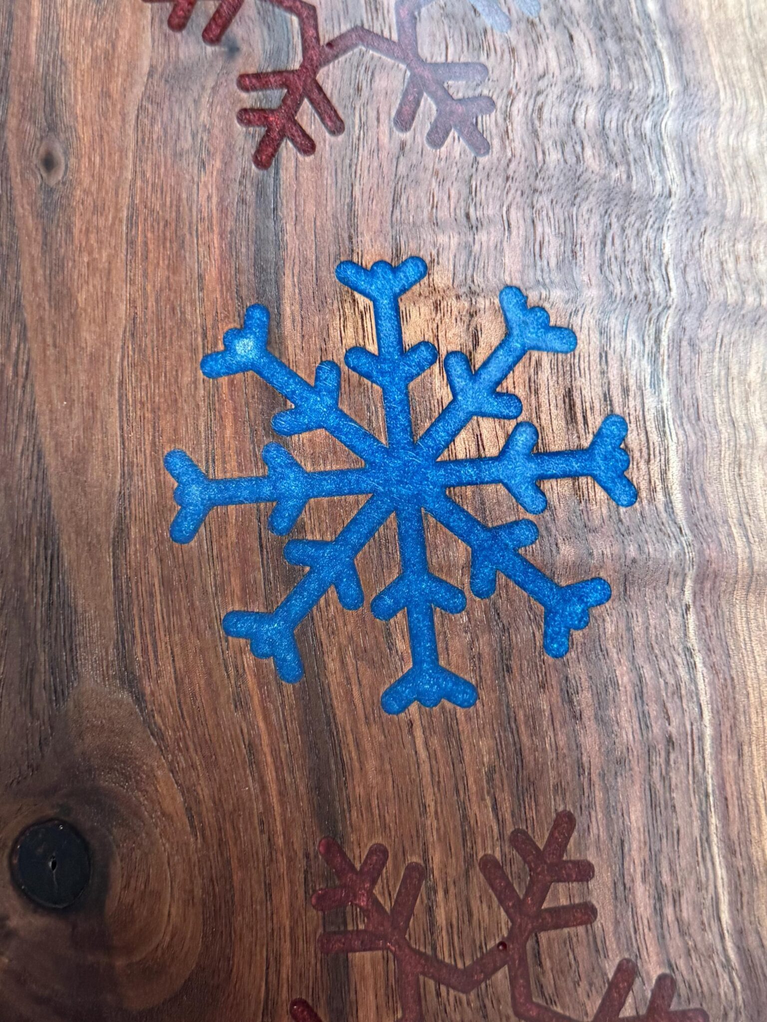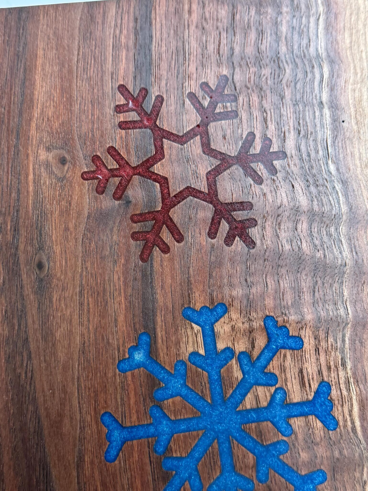 Introducing our exquisite Live Edge, Solid Wood Black Walnut Charcuterie Boards, Cheese Boards, or bread boards that were meticulously crafted to elevate your culinary presentation. This cutting board is perfect for any home who enjoys snowflake home decor. It is enhanced with blue and red inlaid resin snowflakes. The boards measure 12 inches x 8 inches approximately, this functional piece of art is perfect for any beach home. Ideal for serving fresh oven-baked bread, cheese, crackers, and a variety of appetizers, this resin cutting board masterpiece is visually stunning and practical. The fluid art design seamlessly wraps around the edges and is coated with resin, ensuring the durability and protection of the intricate paintwork.To enhance the natural grain of the wood, the entire board is coated in Walrus oil. Ideal for serving fresh oven-baked bread, cheese, crackers, and a variety of appetizers, this live edge cutting board masterpiece is visually stunning and practical. To enhance the natural grain of the wood, the entire board is coated in Walrus oil.