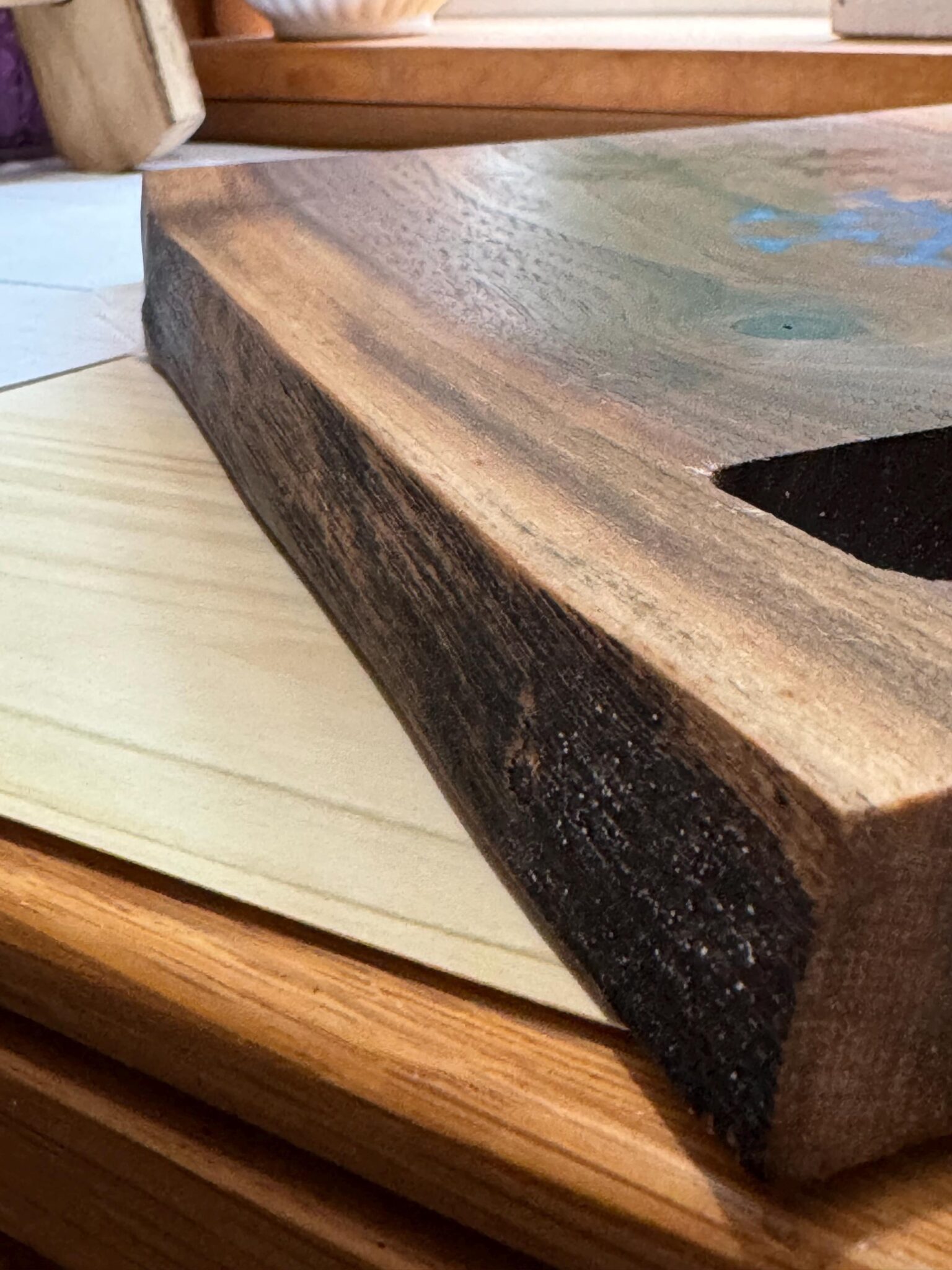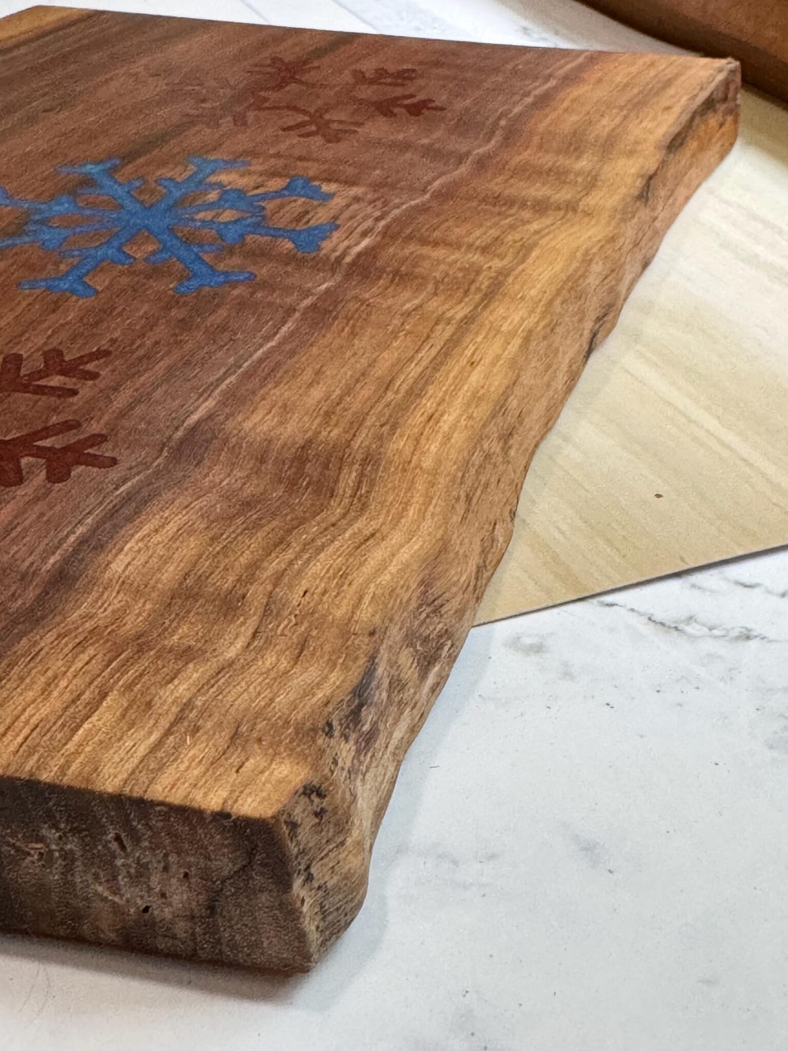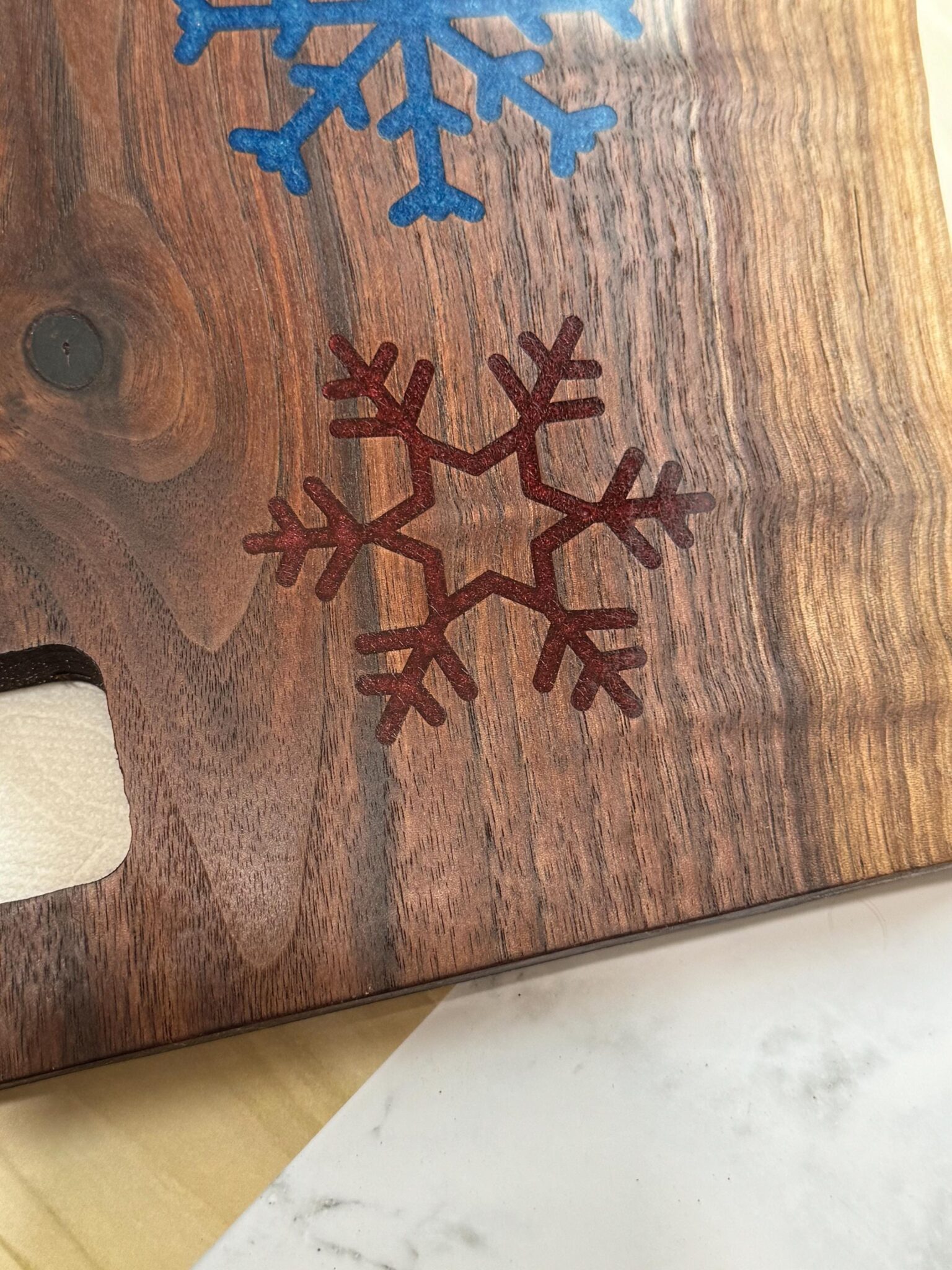 Introducing our exquisite Live Edge, Solid Wood Black Walnut Charcuterie Boards, Cheese Boards, or bread boards that were meticulously crafted to elevate your culinary presentation. This cutting board is perfect for any home who enjoys snowflake home decor. It is enhanced with blue and red inlaid resin snowflakes. The boards measure 12 inches x 8 inches approximately, this functional piece of art is perfect for any beach home. Ideal for serving fresh oven-baked bread, cheese, crackers, and a variety of appetizers, this resin cutting board masterpiece is visually stunning and practical. The fluid art design seamlessly wraps around the edges and is coated with resin, ensuring the durability and protection of the intricate paintwork.To enhance the natural grain of the wood, the entire board is coated in Walrus oil. Ideal for serving fresh oven-baked bread, cheese, crackers, and a variety of appetizers, this live edge cutting board masterpiece is visually stunning and practical. To enhance the natural grain of the wood, the entire board is coated in Walrus oil.