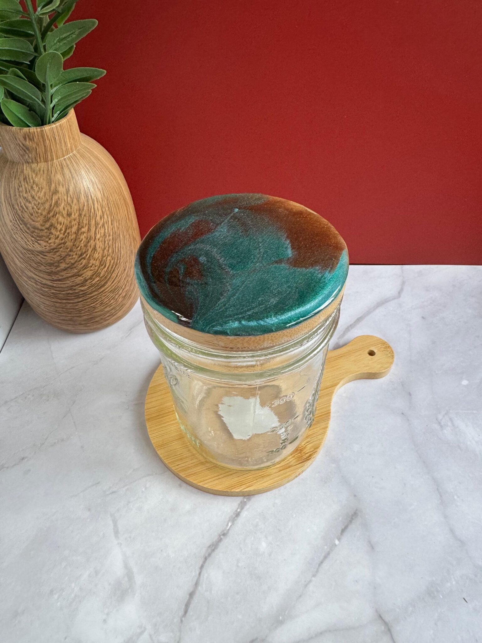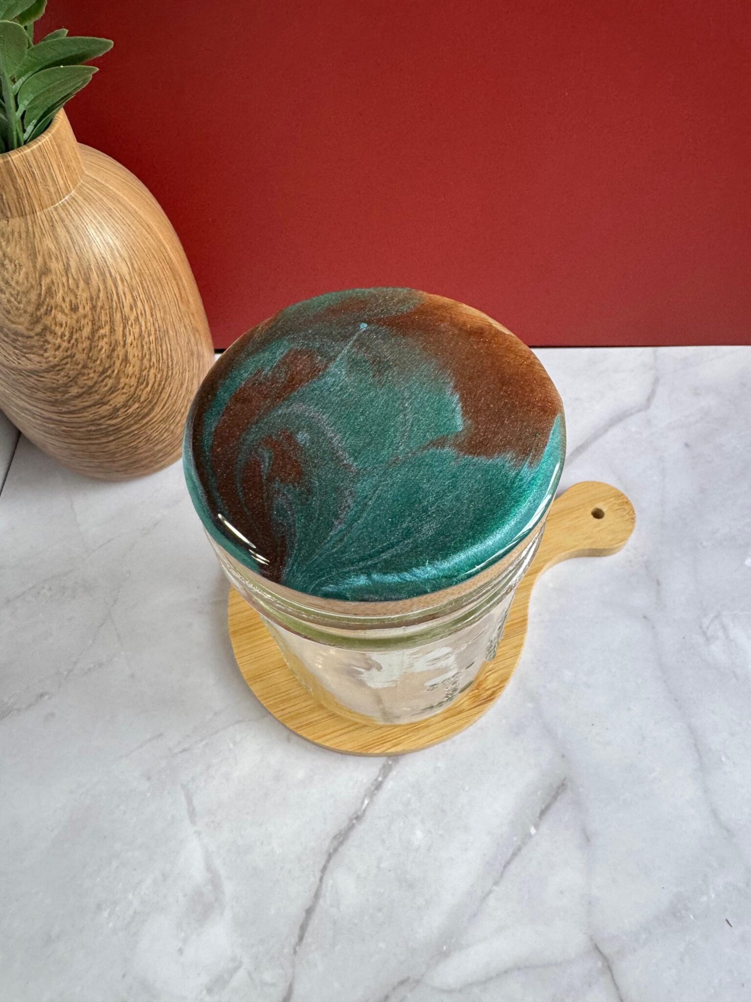 This solid bamboo mason jar lid is hand-painted in the acrylic bloom style of pour painting. Each lid is created with a mix of solid and metallic colors and sealed with a protective layer of resin, giving it a beautiful shimmer when the light hits.
