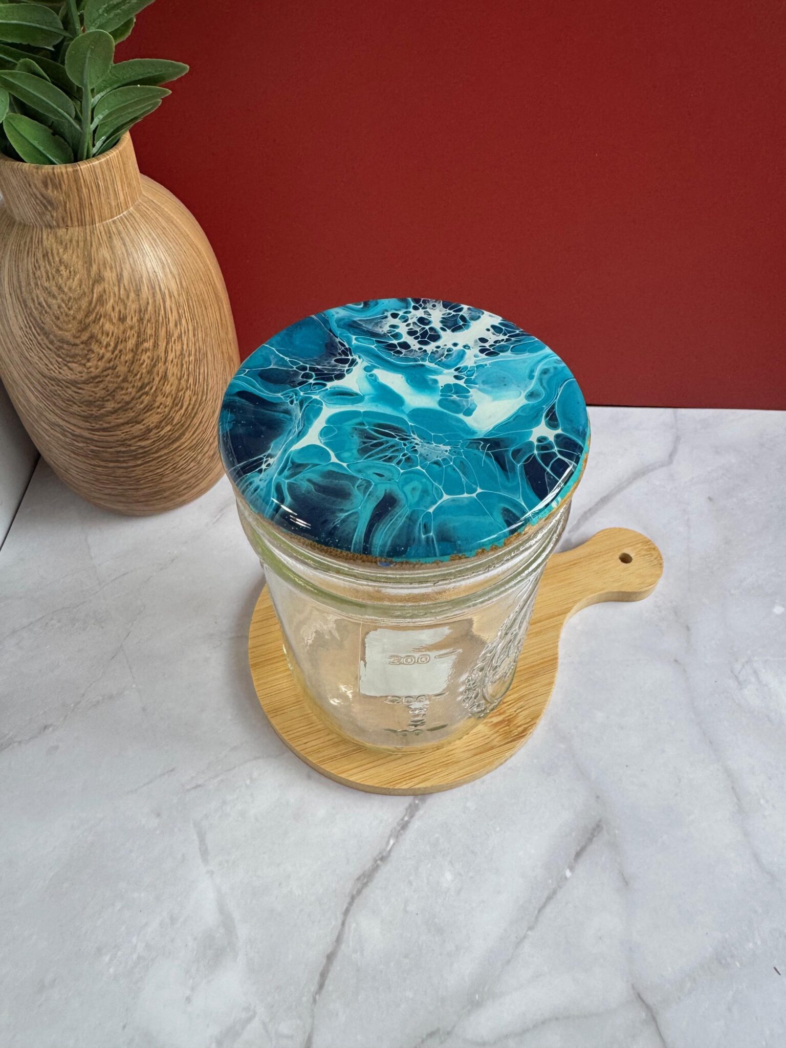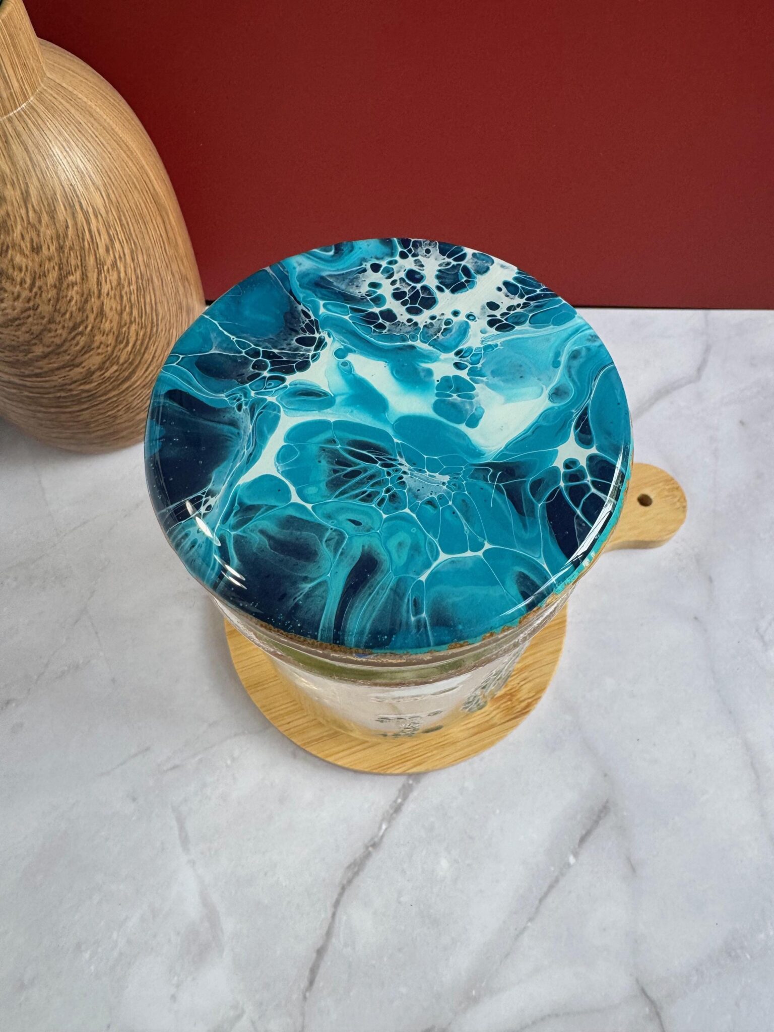 This solid bamboo mason jar lid is hand-painted in the acrylic bloom style of pour painting. Each lid is created with a mix of solid and metallic colors and sealed with a protective layer of resin, giving it a beautiful shimmer when the light hits.