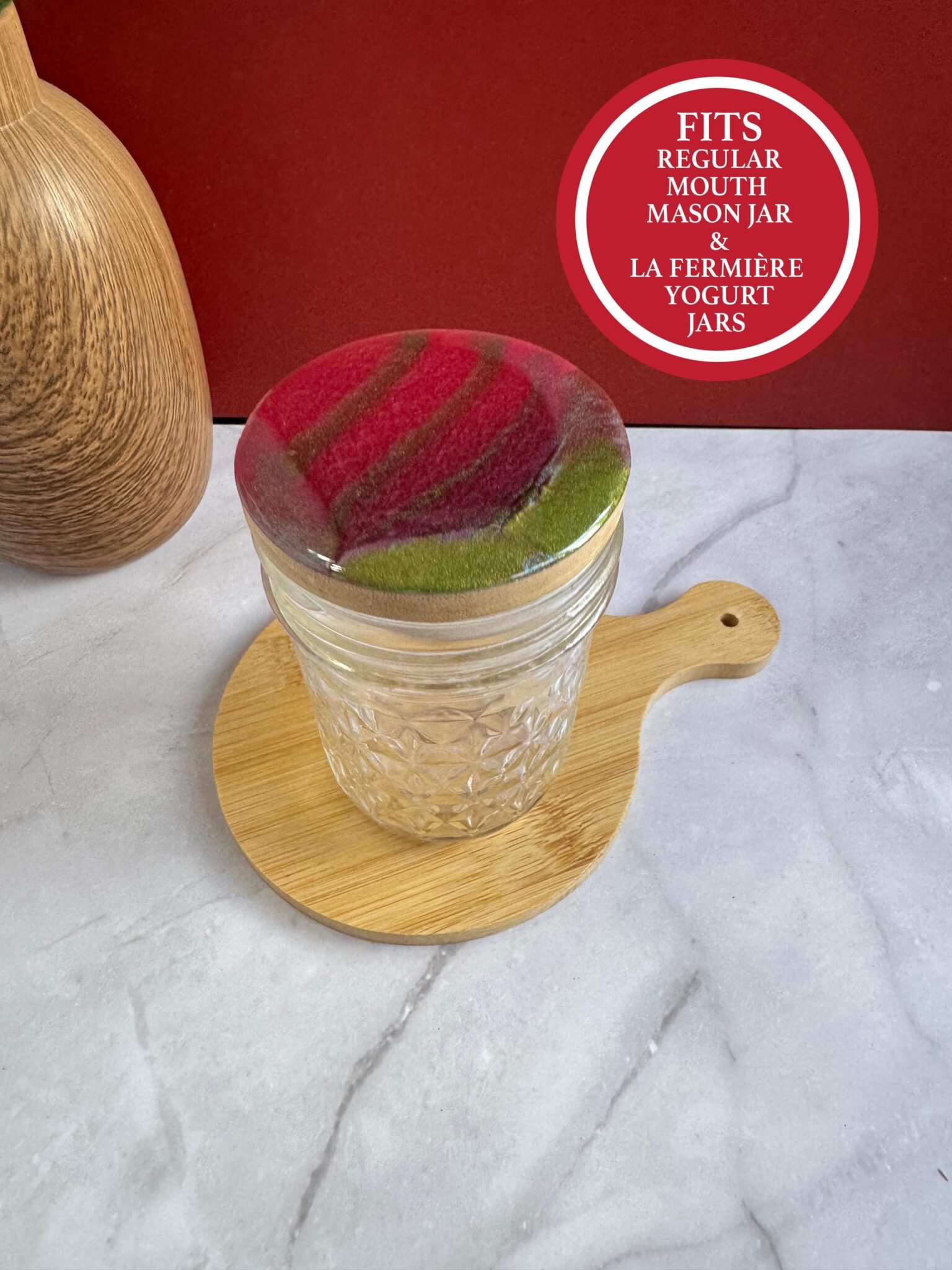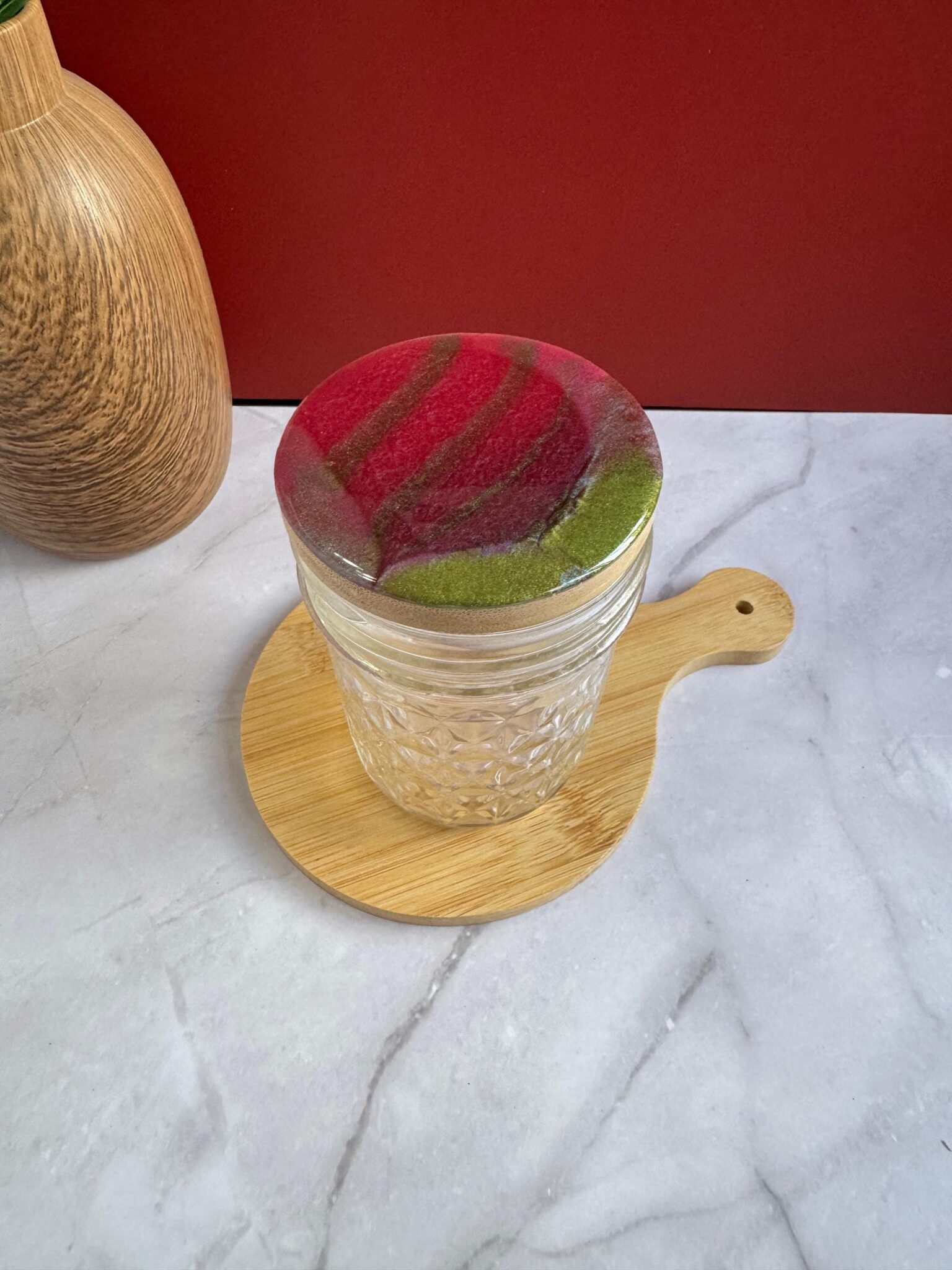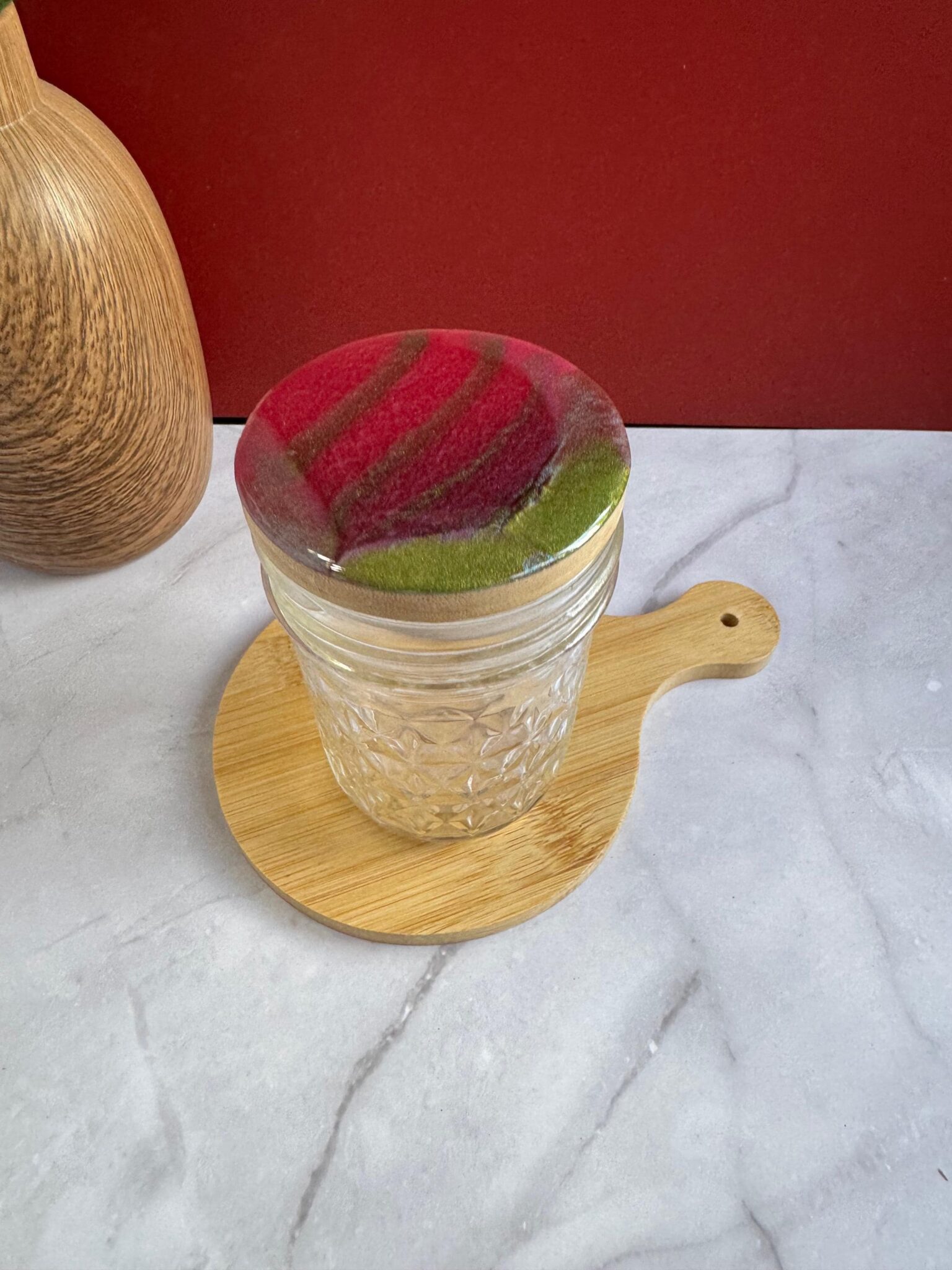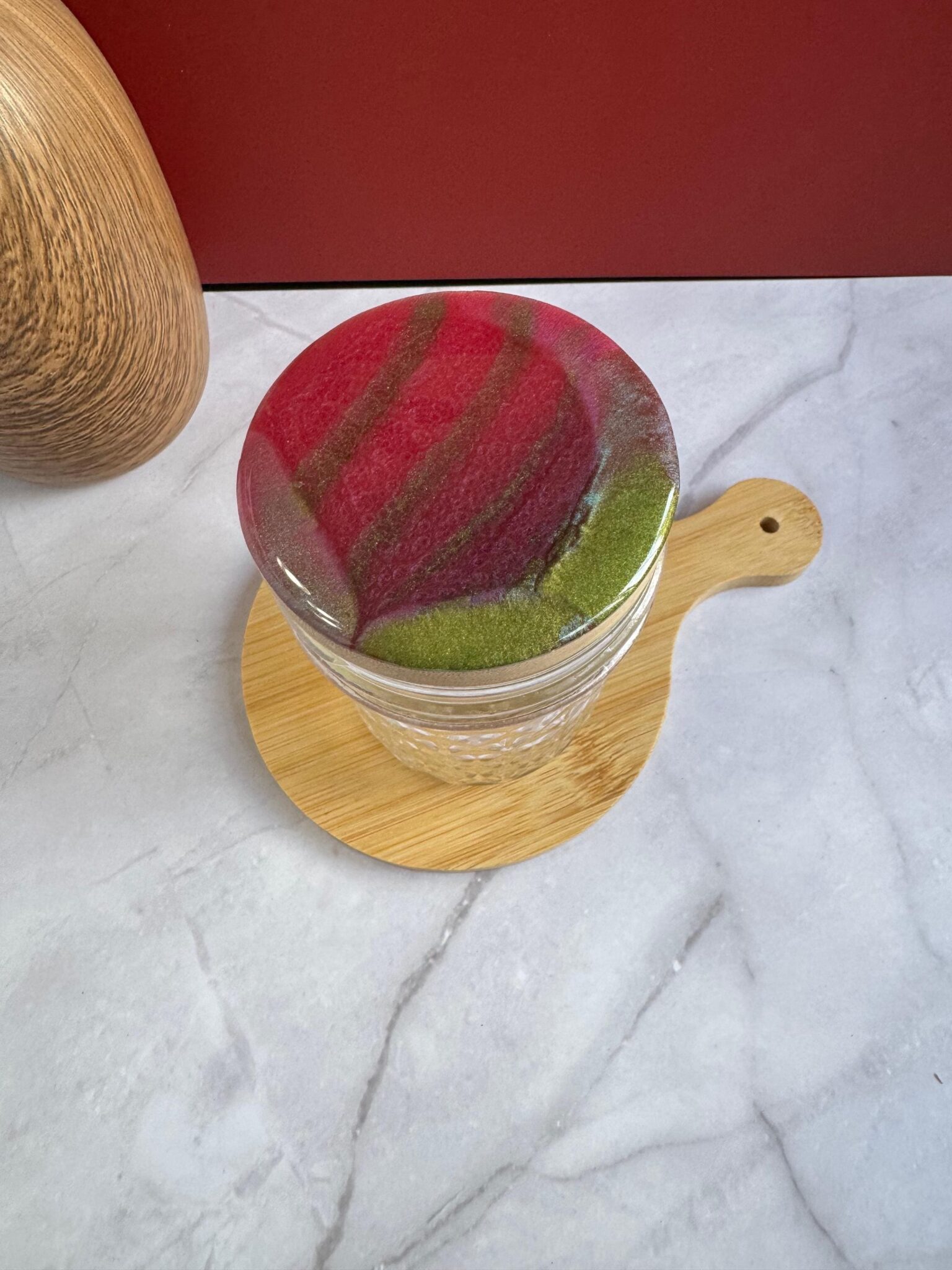 This solid bamboo mason jar lid is hand-painted in the acrylic bloom style of pour painting. Each lid is crafted with a blend of solid and metallic colors and sealed with a protective layer of resin, resulting in a beautiful shimmer when the light hits.