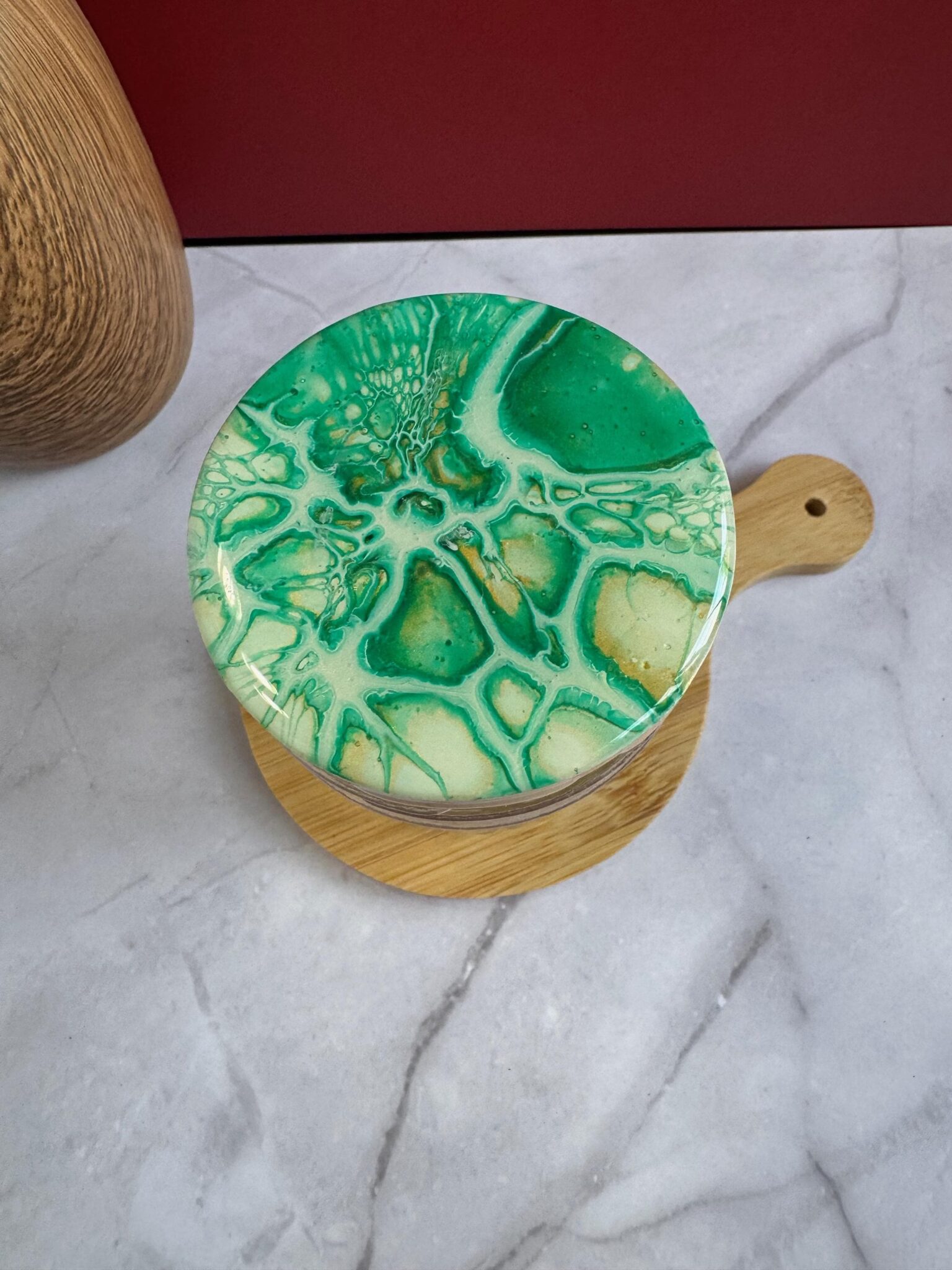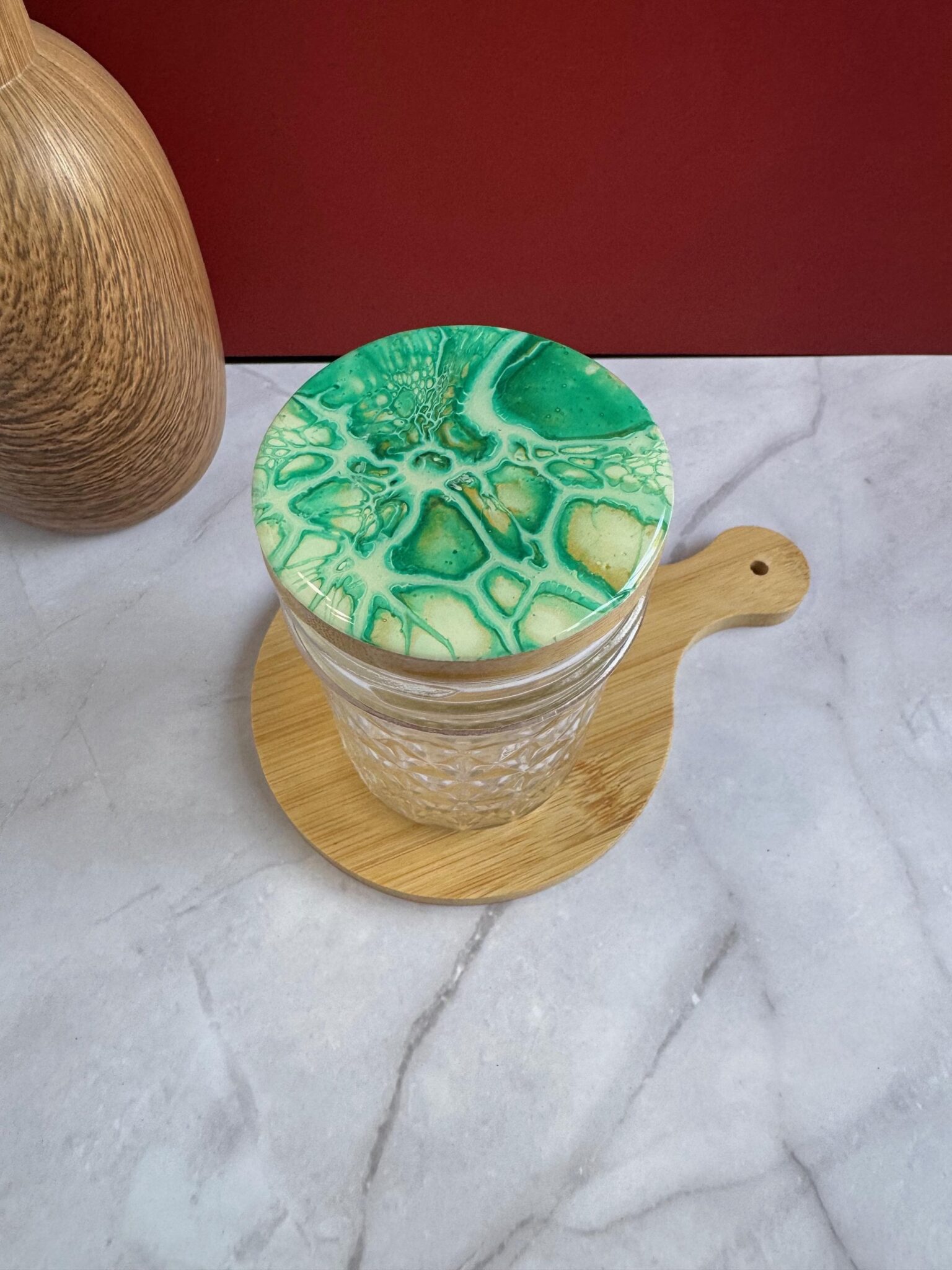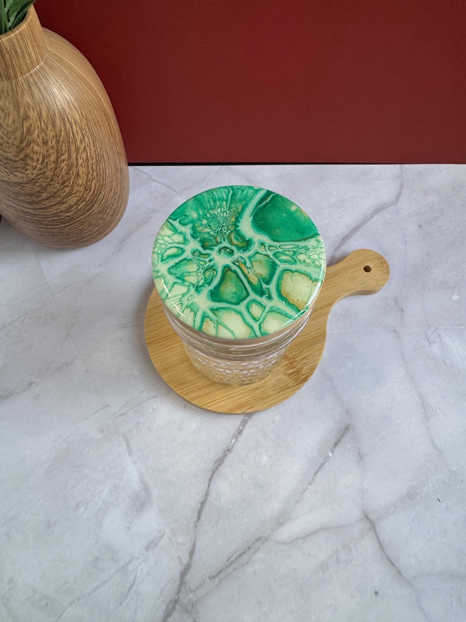 This solid bamboo mason jar lid is hand-painted in the acrylic bloom style of pour painting. Each lid is crafted with a blend of solid and metallic colors and sealed with a protective layer of resin, resulting in a beautiful shimmer when the light hits.
