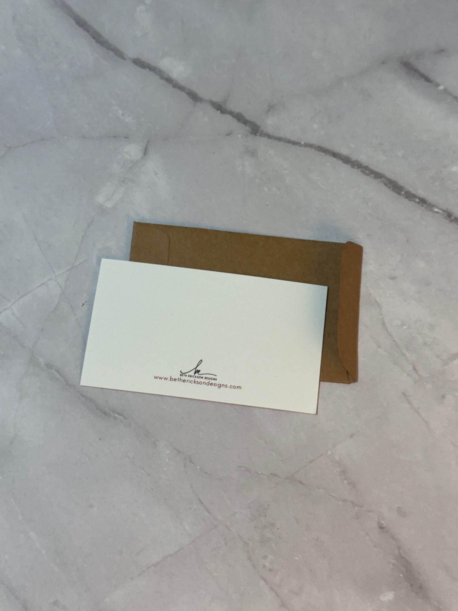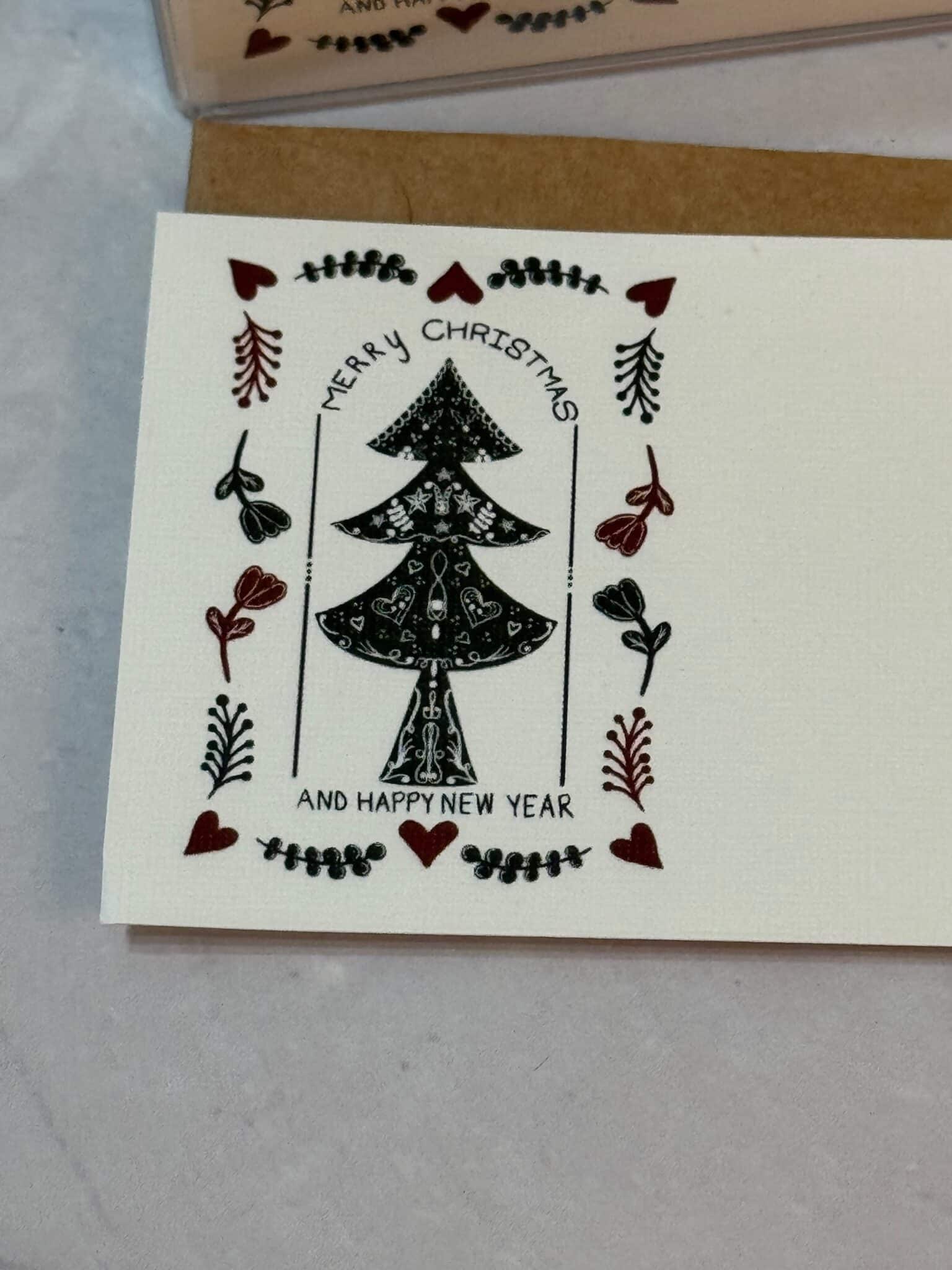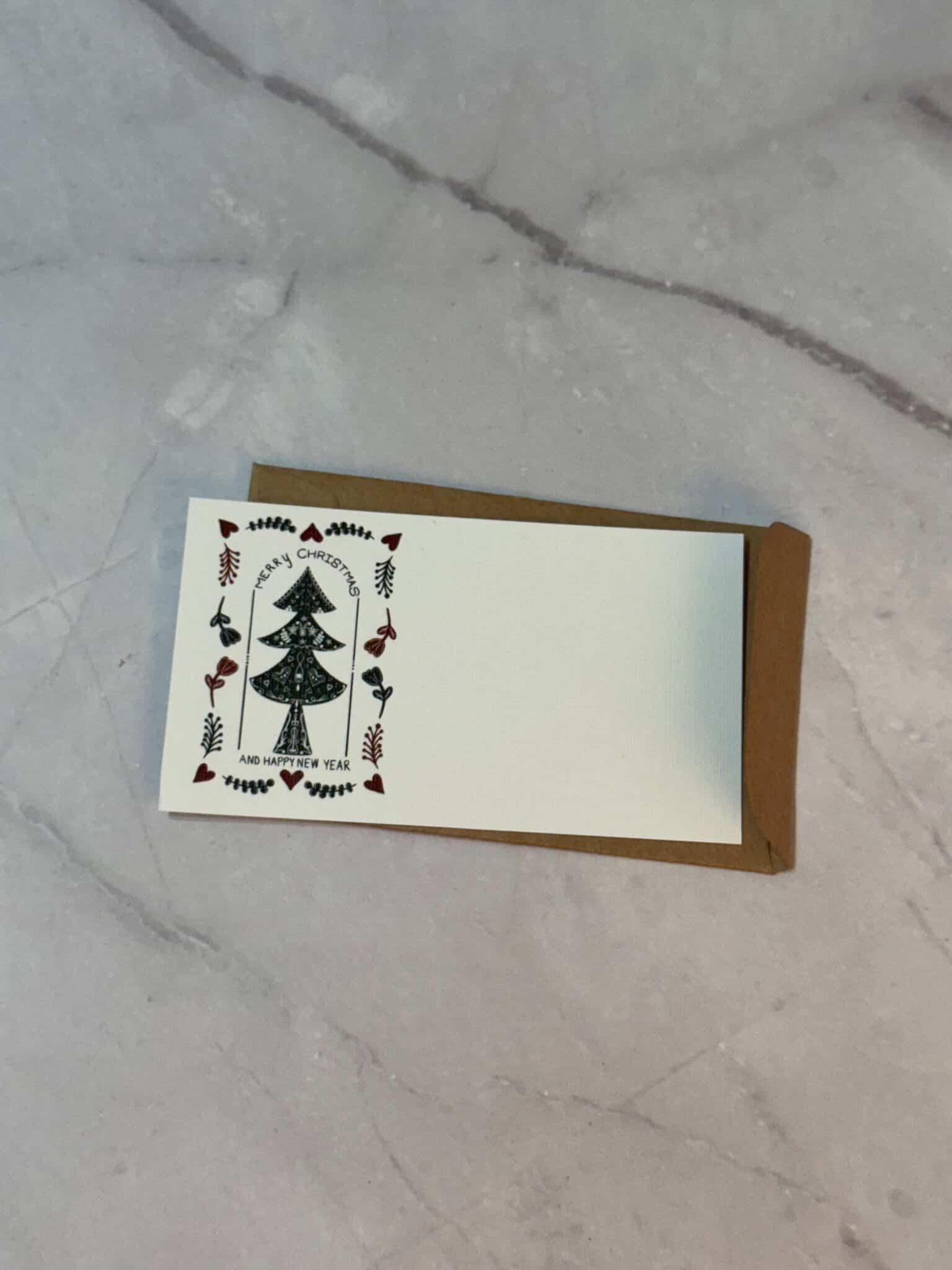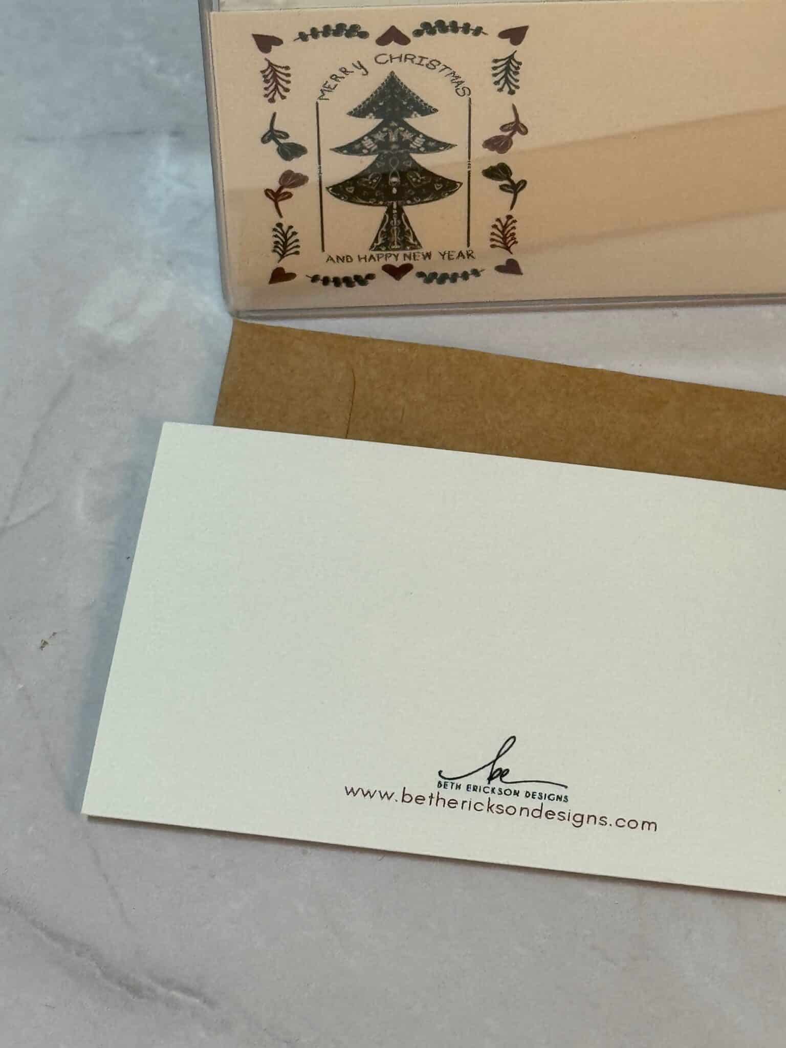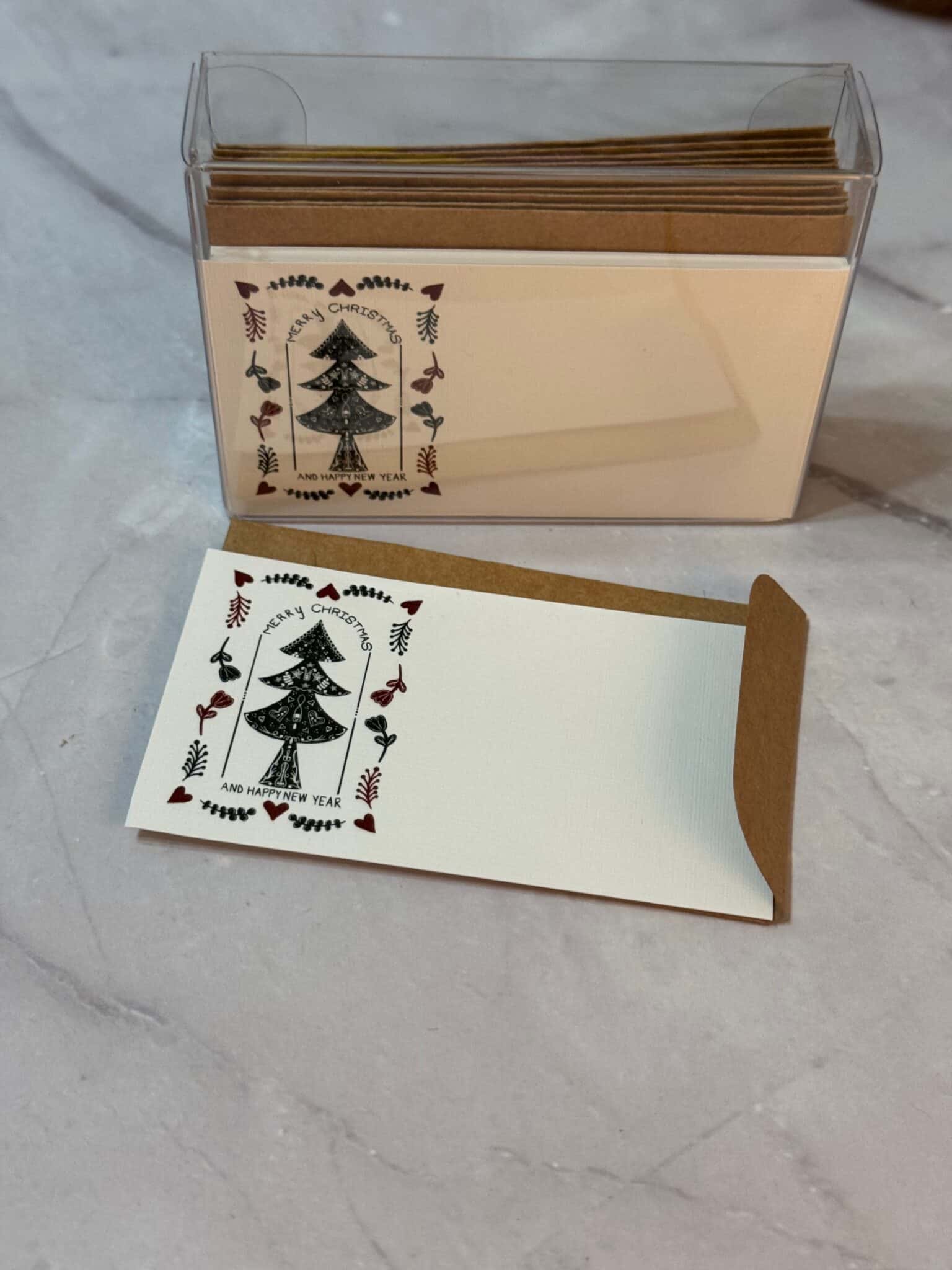 Each set includes 5 mini cards, beautifully printed on linen-textured white cardstock for a high-quality, tactile finish. The cards are blank inside—ready for your personalized holiday message—and come with coordinating kraft envelopes for a rustic, natural look.