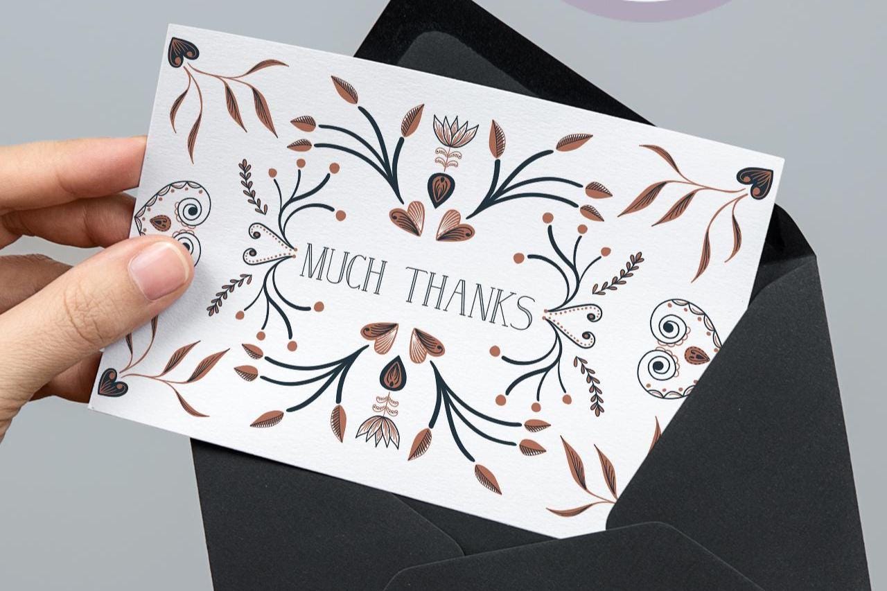 Say thank you in style with this beautifully designed Scandinavian-inspired thank you card. Featuring a hand-illustrated folk art pattern in rich purples and greens, this 5X7 folded card adds a touch of warmth and charm to every note of gratitude.