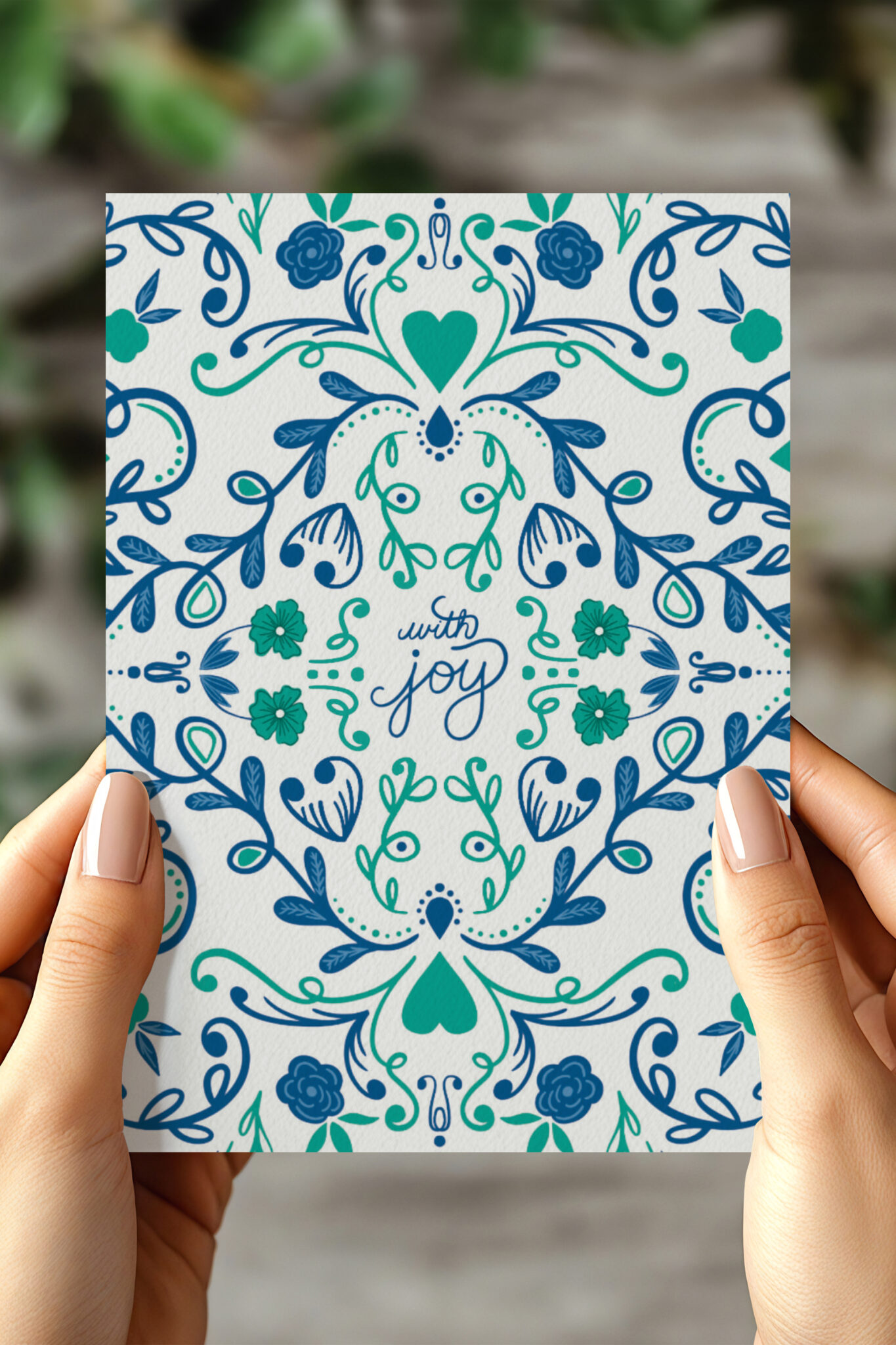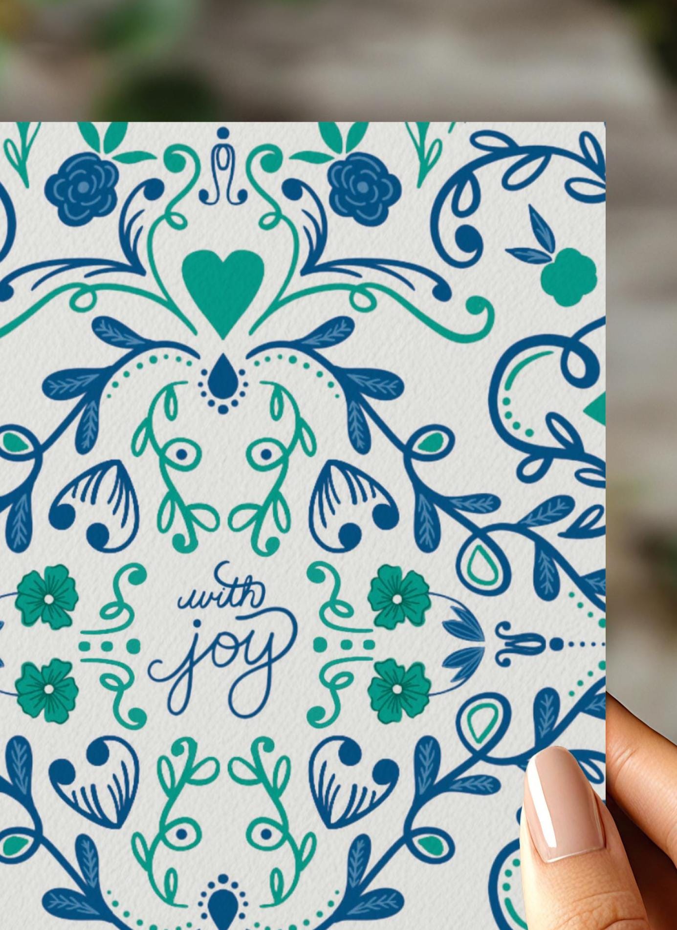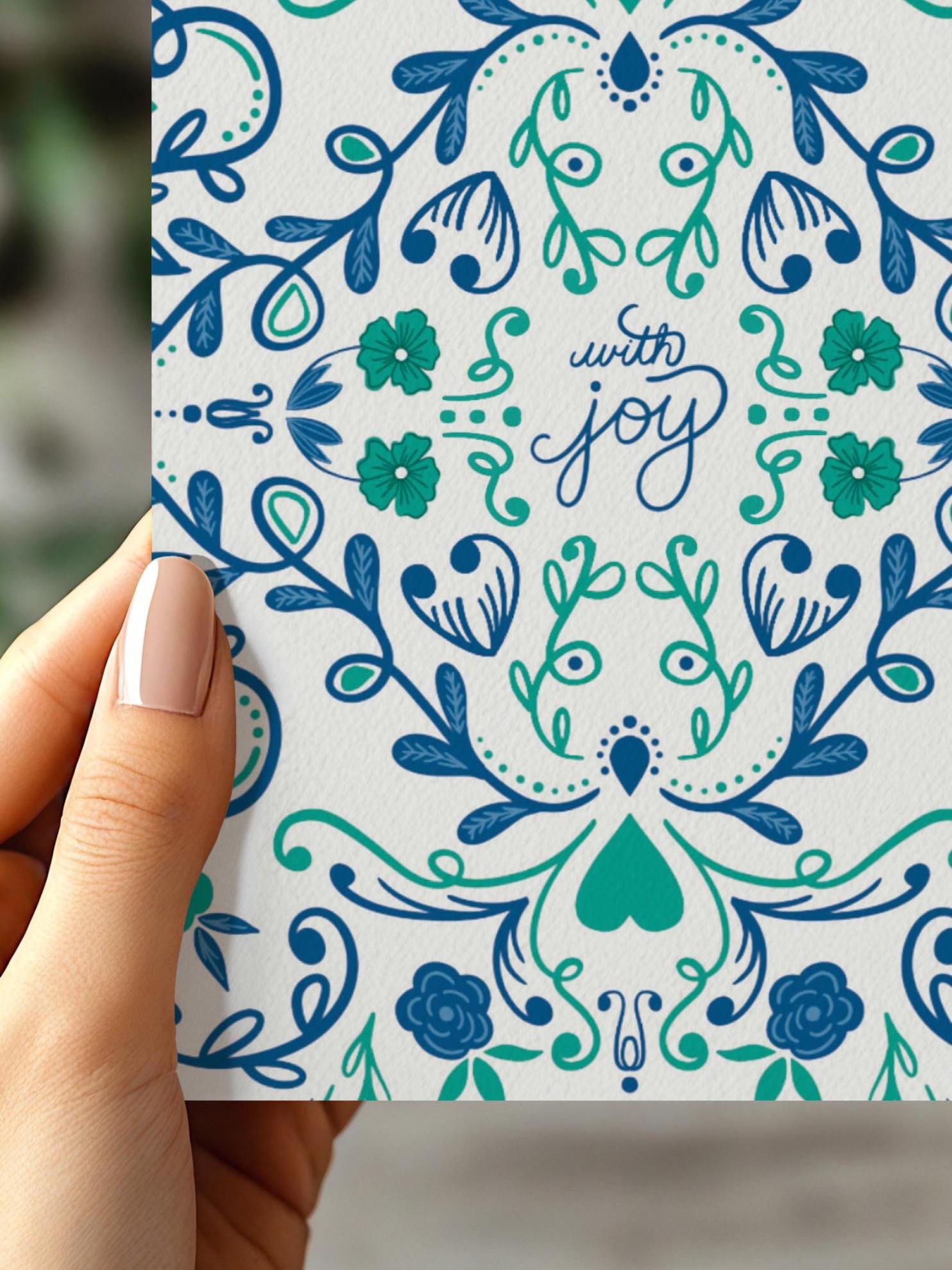 Bring a touch of Scandinavian charm to your correspondence with these beautifully designed blank note cards. Each 4.375" x 5.75 inches (A2 size) card features original folk art-inspired artwork, perfect for any big occasion! This card features the inscription "With Joy." Ideal for weddings, birthdays, graduations, or any special celebration!