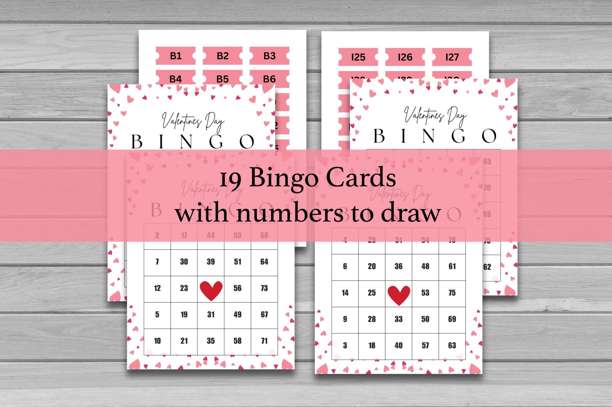 This set includes 19 unique Bingo cards along with a complete Valentine-themed calling sheet featuring numbers from B1–O75, making it simple to host a full game right away. With its cheerful design and easy setup, this Bingo game is perfect for kids, families, couples, and groups of friends.